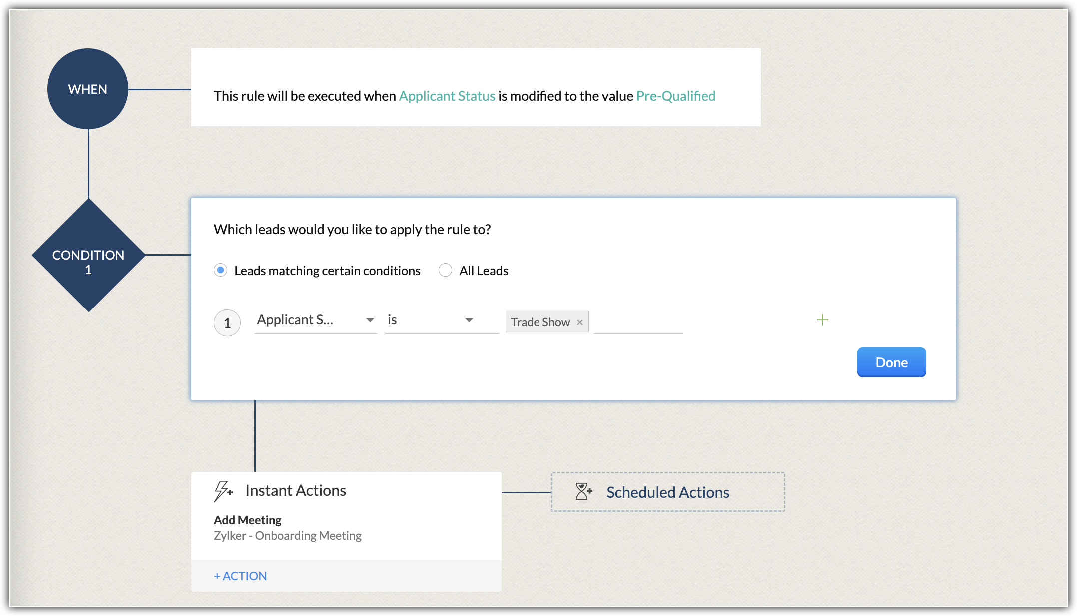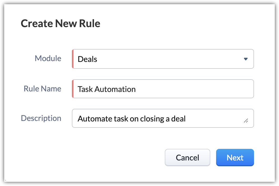 A workflow rule is meaningful only if an action is associated to it. These actions include email notifications, tasks, field updates, webhooks, custom functions, activities - tasks, meetings and calls, and create record. Except create record, all the other actions are grouped under the Actions (under Automations) that can either be Instant or Scheduled . These actions once created, can be associated with many rules.