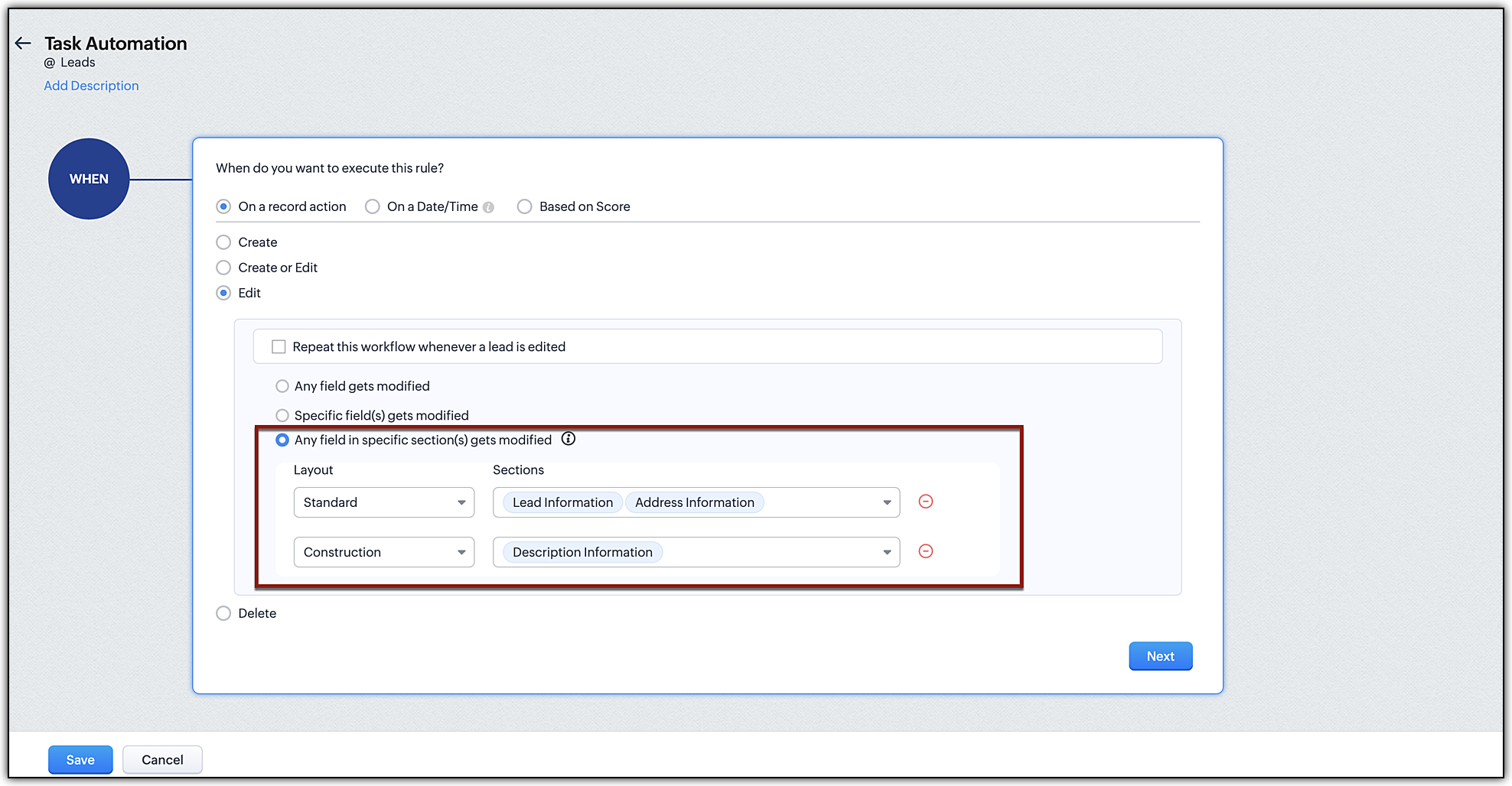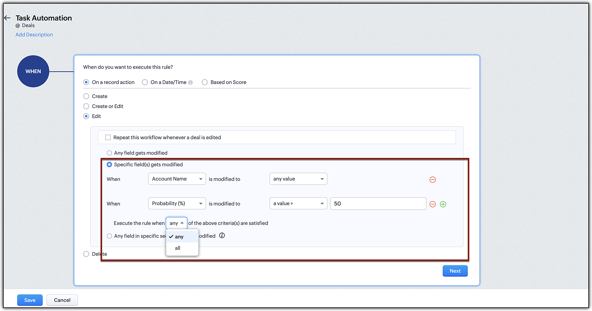 When new leads are created in Zoho CRM you may want to send an email automatically or a series of emails at set intervals. You may also want to create tasks for these new leads. Also, sometimes when specific fields are updated, you may want to trigger a workflow. This execution option lets you specify an action (Create, Edit, Delete, etc.) based on which workflow rules will be triggered.
