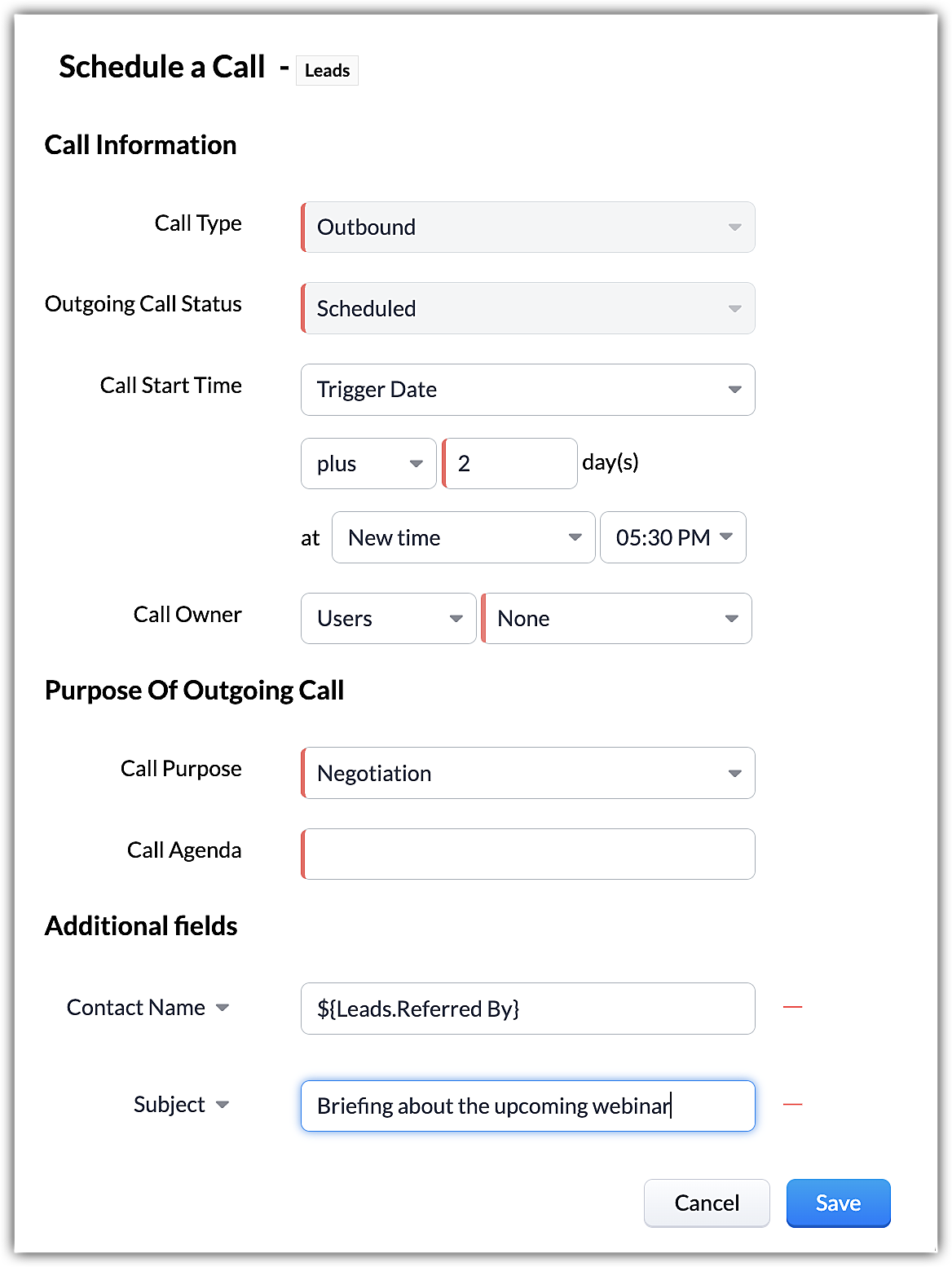 Scheduling a call as an instant action will be displayed only for rules created for Leads and Contacts modules.