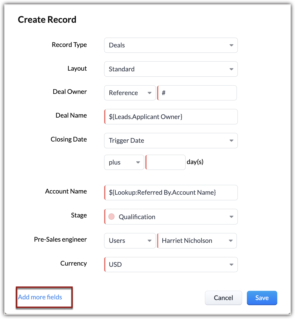Enter the values for fields like record name, amount etc. The values that you enter here will be pre-populated for the record that is created. By default, the mandatory fields (both standard and custom fields) from the layout will be displayed here, you can also add the additional fields present in the layout and enter a value. You can either enter the values or use merge fields. For example, the email field values can be entered using the merge fields.