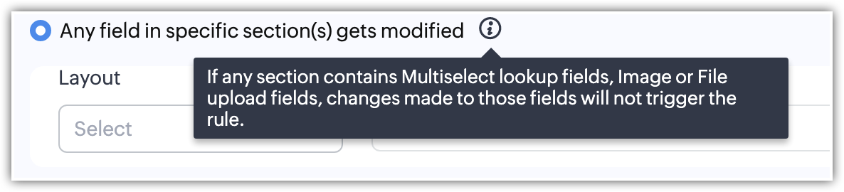 You may want to get an email reminder a week before a deal's expected closing date, or may want to send an email to the customers reminding them of the monthly rentals or subscription renewals. In these cases, it is not necessary that the records should be created or edited for the rule to get triggered. It is plainly based on the value in the date fields. This execution option lets you pick a date field from a record and allows you to define the day for the rule to be triggered.