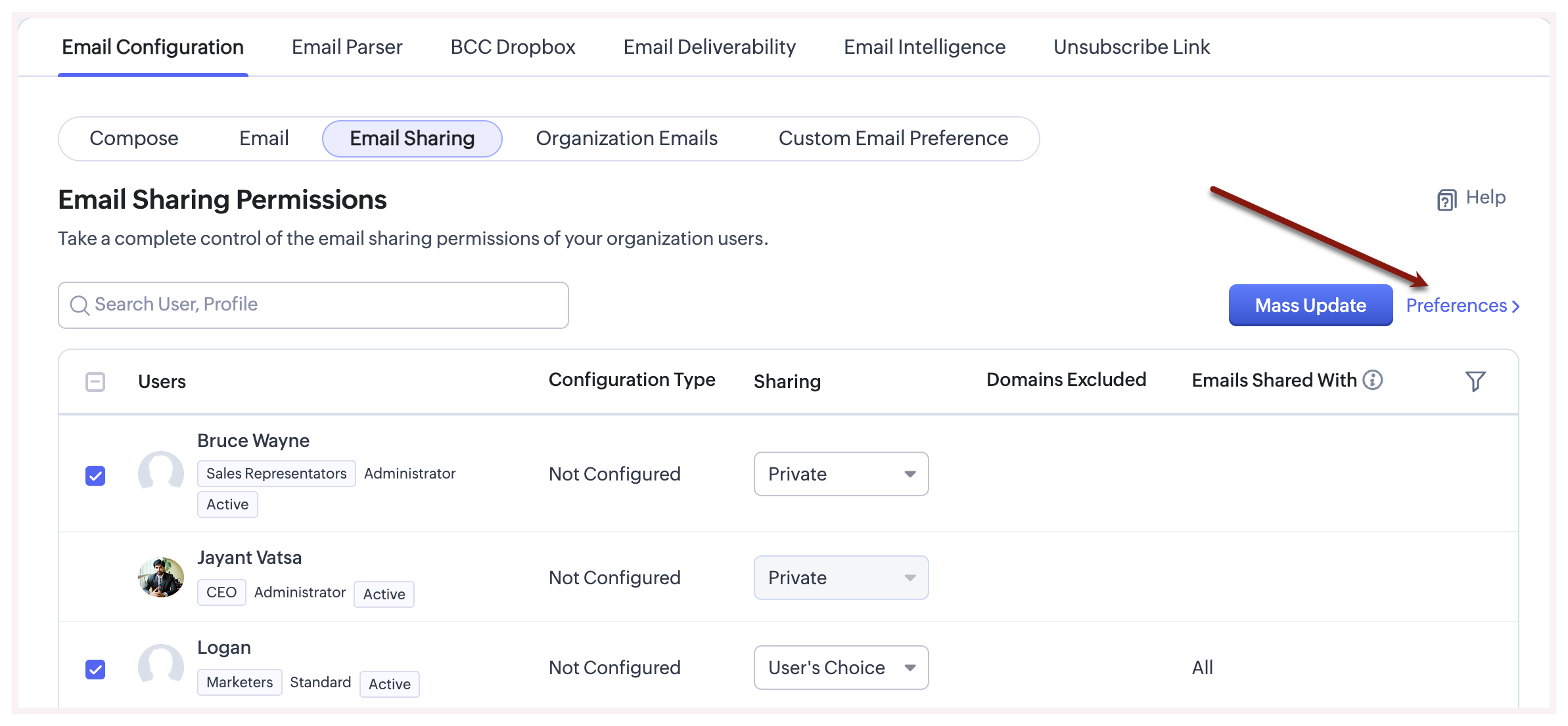 Email preference allows users with administrator profile to set email sharing permissions based on roles. For example, if the organization requires all Assistant Manager's to share emails with their colleagues as and when needed, then it is much easier to set the email sharing permission for this role as User's preference. This way any user who is in the Assistant Manager's role will have the same privilege.