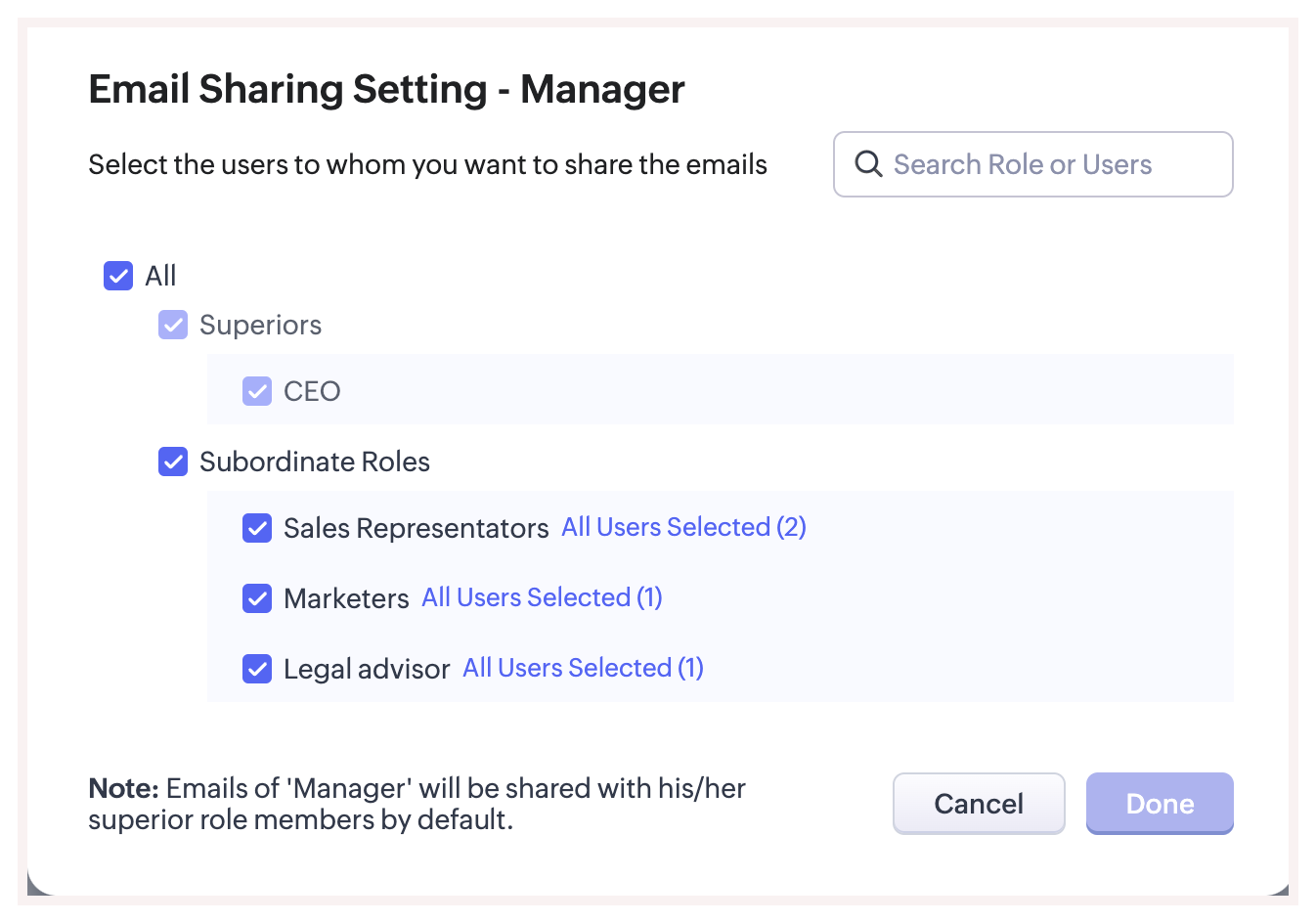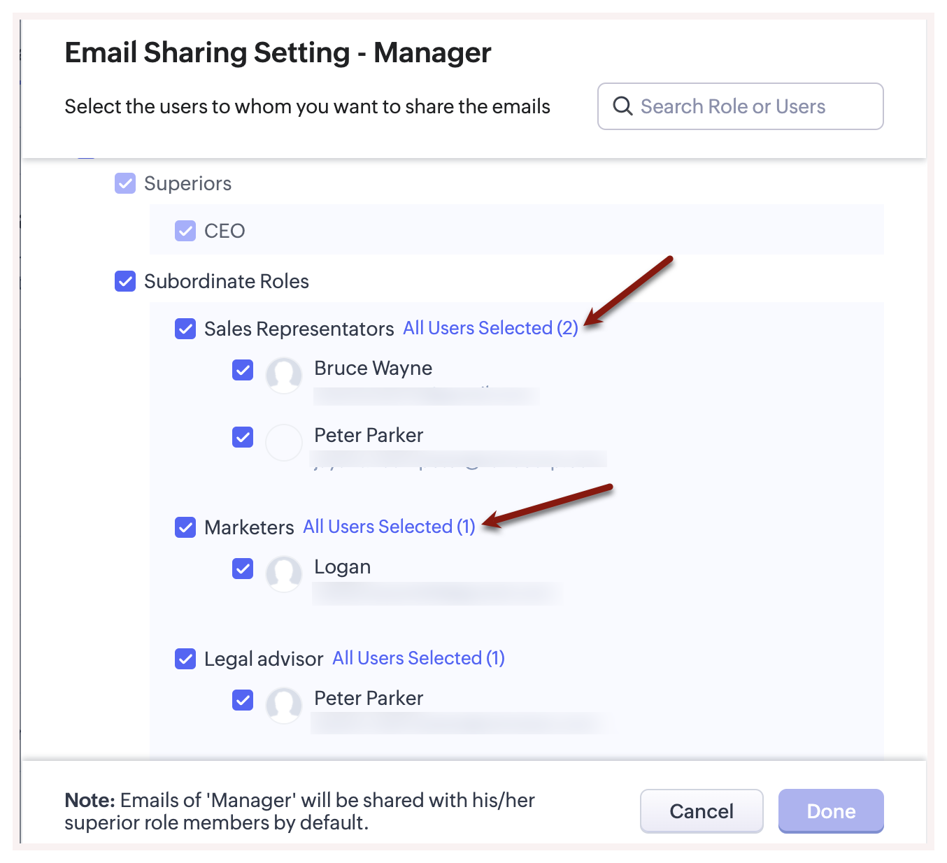 1. Emails of users in a role will be shared with the members in the immediate superior role by default. This cannot be edited.