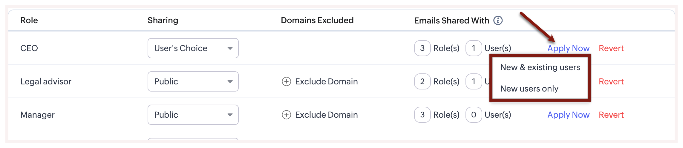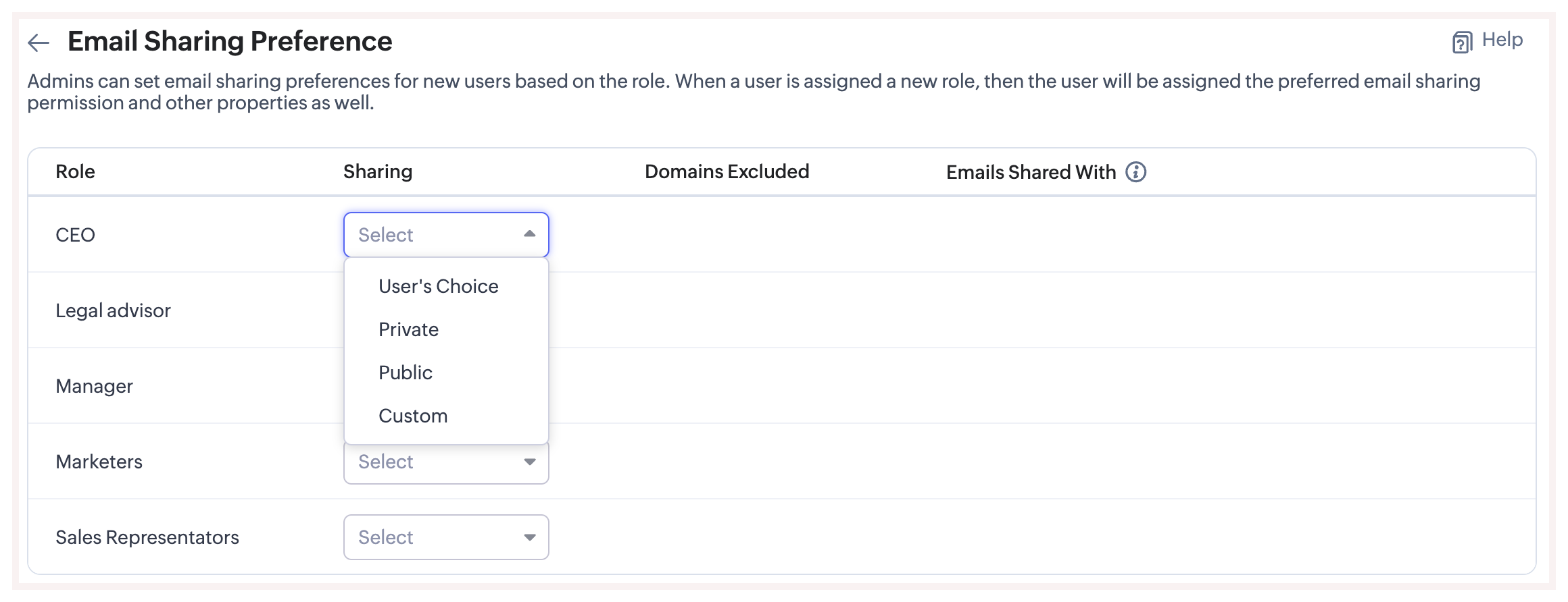 Thus, as soon as a user is assigned a role the pre-defined email sharing permission is automatically applied. In addition, the excluded domains and the list of users or roles with whom emails can be shared will also be applicable.
