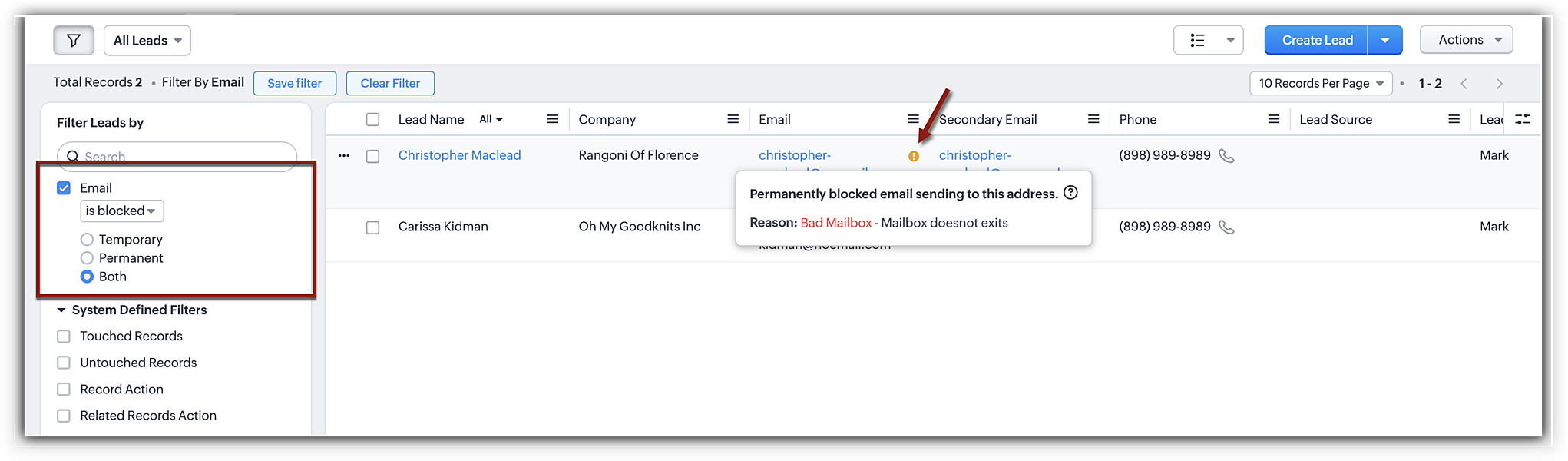 Others | The recipient's mailbox is not reachable due to unknown reasons. | When an email bounce reason does not fall into any of the above-listed categories, it will be marked as 'Others'. One of the possible solutions is to ask your recipient's organization to whitelist the IP addresses your Zoho CRM account uses to send emails. This includes the default IP addresses, as shown in the section below, but could also include your IP addresses if you have set up email relay servers. We recommend that you resolve the issue with your recipients before unblocking them inside Zoho CRM for future email sending. Continue monitoring mail sent to them to avoid future blocks which will also have an impact on your deliverability. |