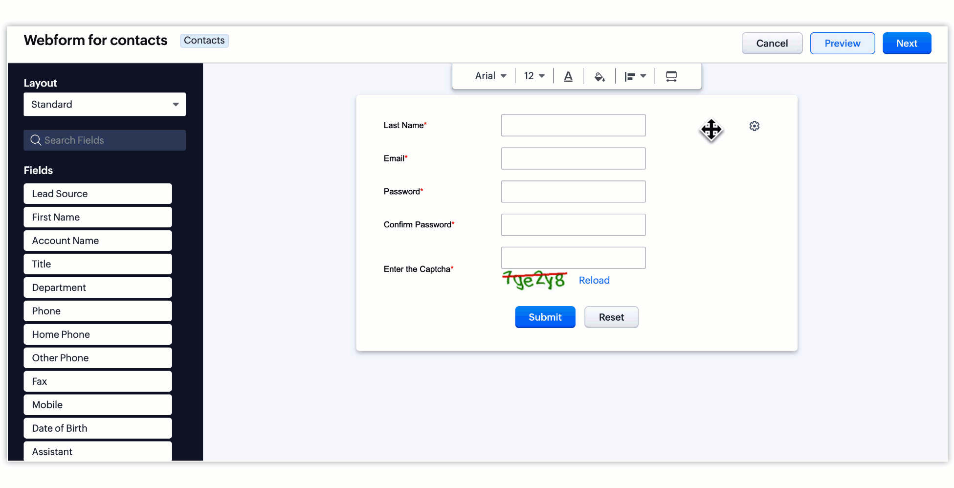 For portal forms, the Zoho CRM provides fields needed for account creation by default. You can also use other available fields by clicking and dragging them into the builder.