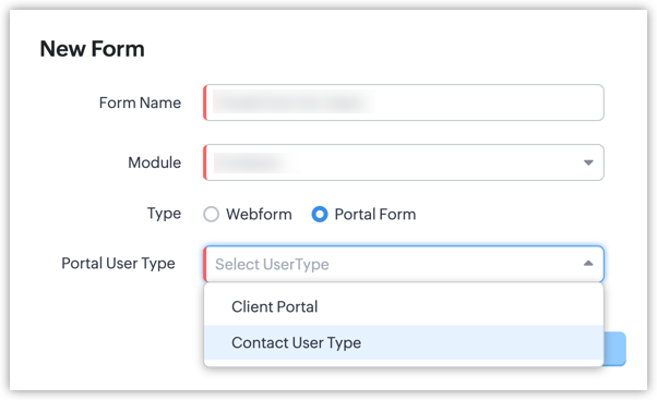 - Choose the portal user type you want to create a portal form for.
