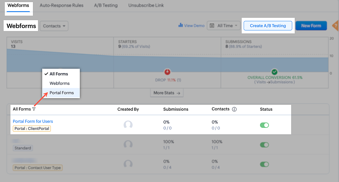Portal forms are quite similar to webforms; all the amenities used in webforms are also available in portal forms. Analytics can be also be done for portal forms, and you can also run A/B testing on them.