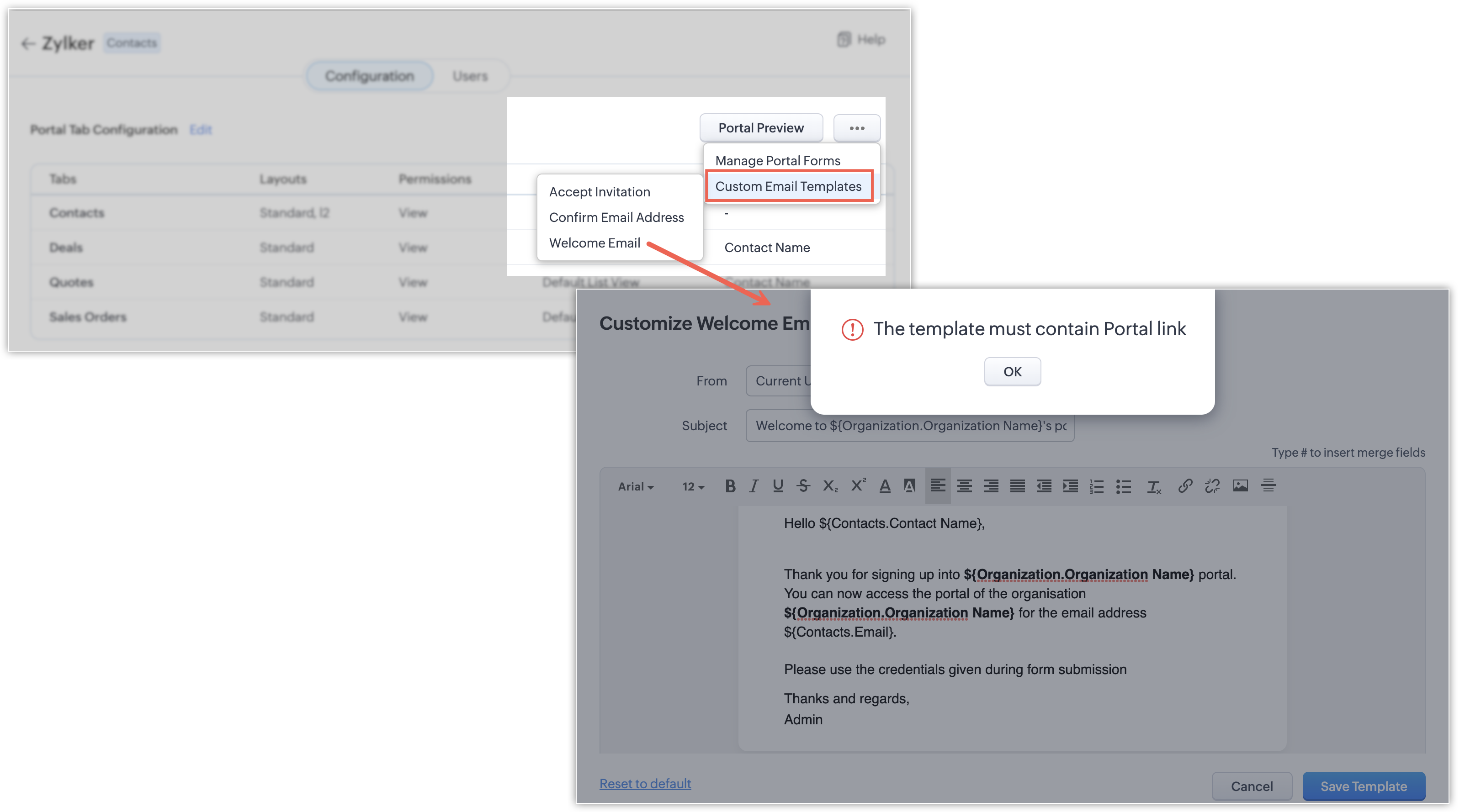 Modify the template as needed. Always remember to add the portal URL link in the email template. An error message is thrown if the portal URL is not added in the email template.