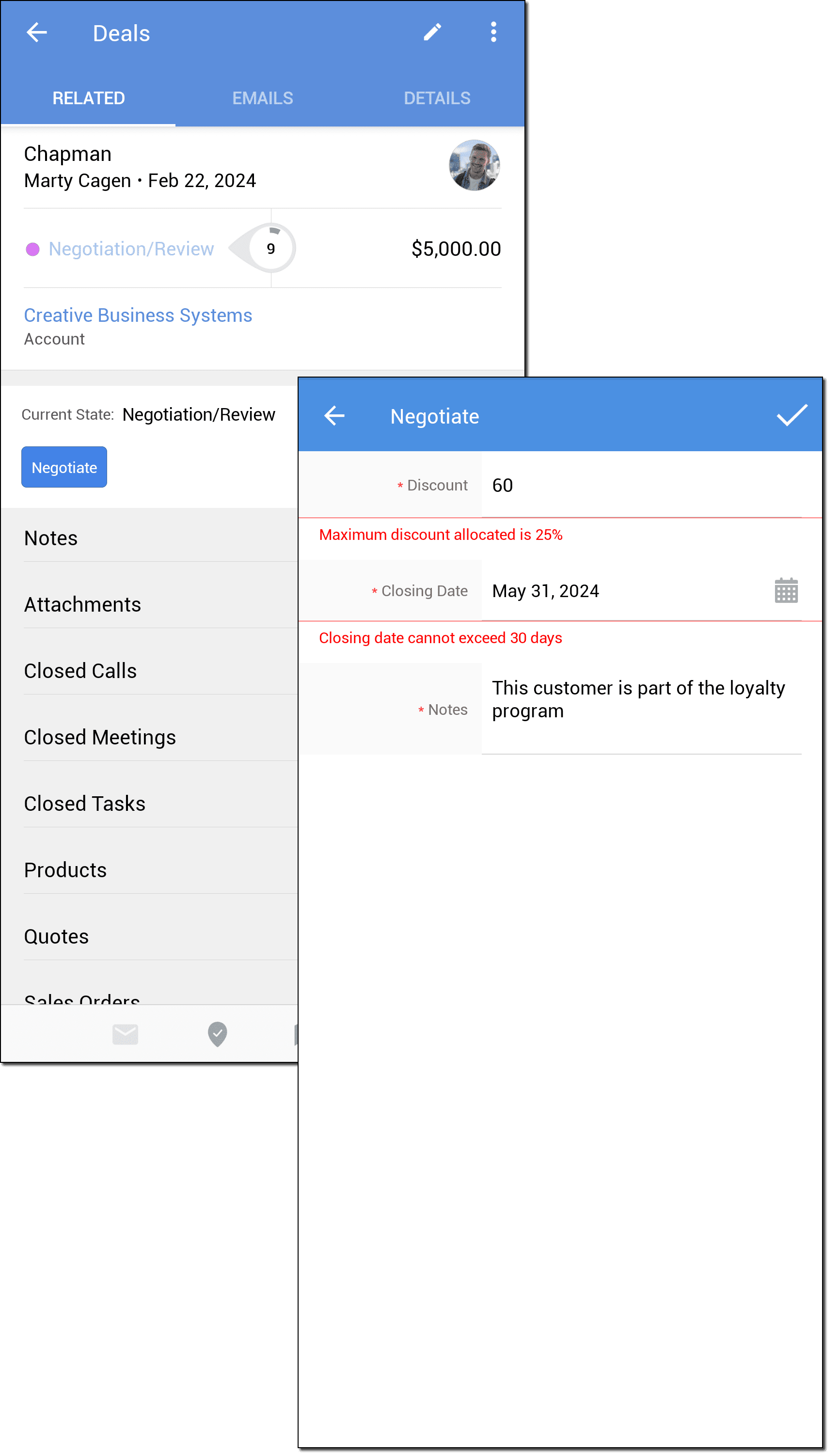 For example, you have configured a transition called "Negotiate", which must be completed in order to move to the next stage. The "Negotiate" transition requires the sales rep to enter a discount which falls within certain parameters and add the details of the negotiation as a note. These requirements can be fulfilled right from the mobile app by executing the "Negotiate" transition. Read more about Designing Blueprints.