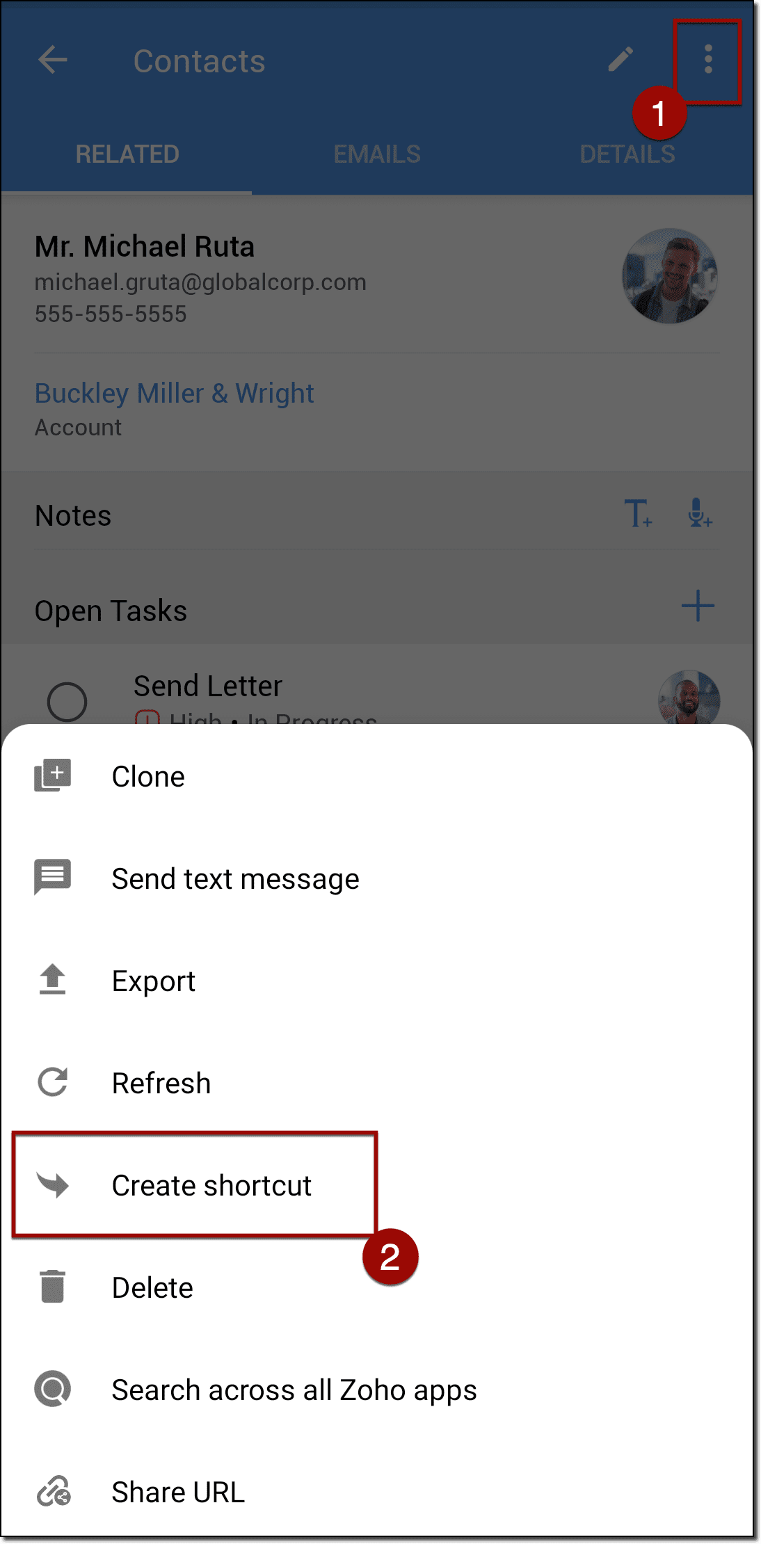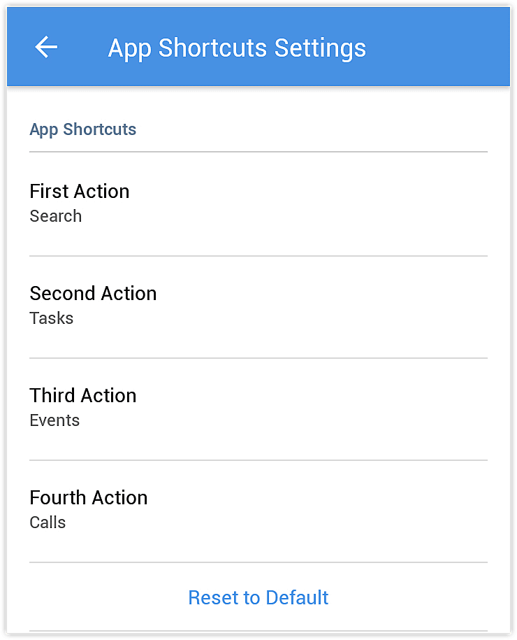 Adding a task, meeting, or account via the CRM mobile app involves a series of steps. You can bypass these steps using app shortcuts, which let you access certain portions of an app directly from your home screen. Press and hold the Zoho CRM app icon to view the available shortcuts. You can also customize these shortcuts.