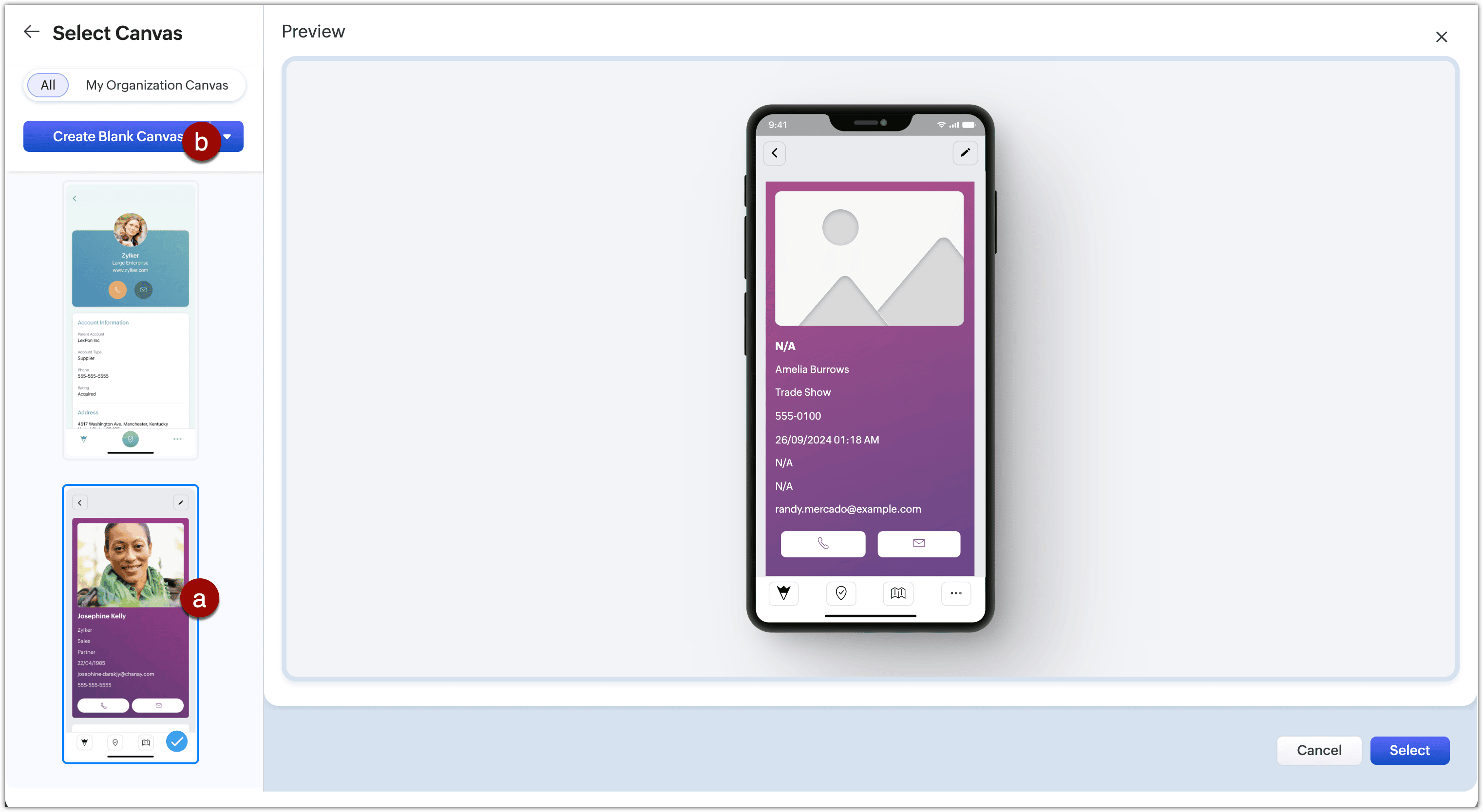 - A component can be reused in canvases created for various CRM modules. The fields created for one module will be automatically mapped and displayed with the fields of the other.