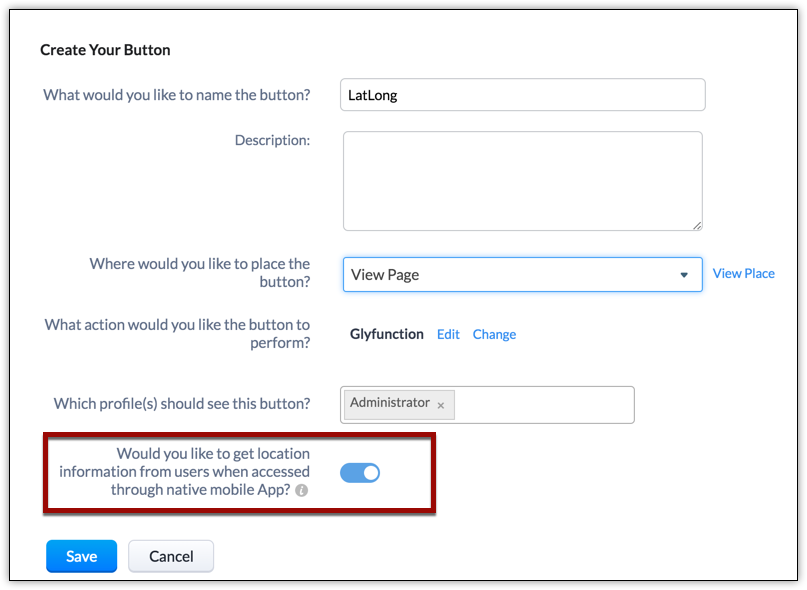 While creating a custom button, along with the actions specified via the function, you can also fetch the location information of the user executing this button.