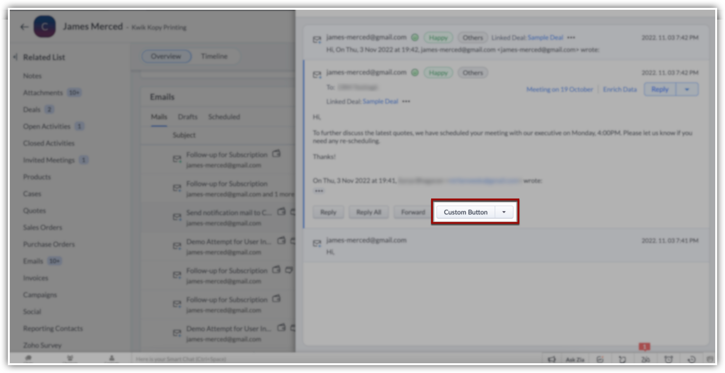 For instance, consider the example of Zylker Electronics that deals in the sale of electronic appliances. They use CRM to maintain sales and after-sales data of their customers. Whenever they receive a post-sale inspection request, they want the field agent to visit the client's location, survey the damages sustained to the appliance and make a note of the same via the Notes feature. To make the Notes more accessible, they have created a custom button called Send Notes and have placed this on the detail view page for every contact. When a field agent pushes this button, the updated Notes will be sent as an email to their managers.