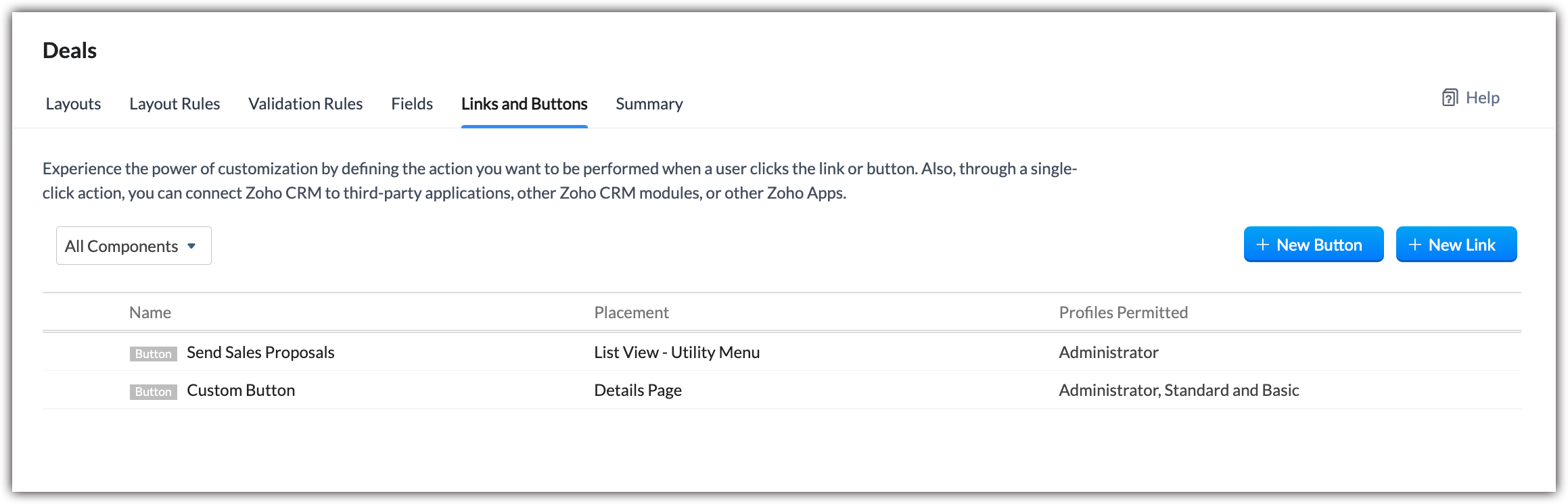 Customization is the most powerful way to build a flexible CRM system. In Zoho CRM, you can customize modules, fields, pages, links, and a lot of other elements. In addition to these elements, Zoho CRM now allows you to create new button actions with the help of an advanced feature called Custom Buttons.