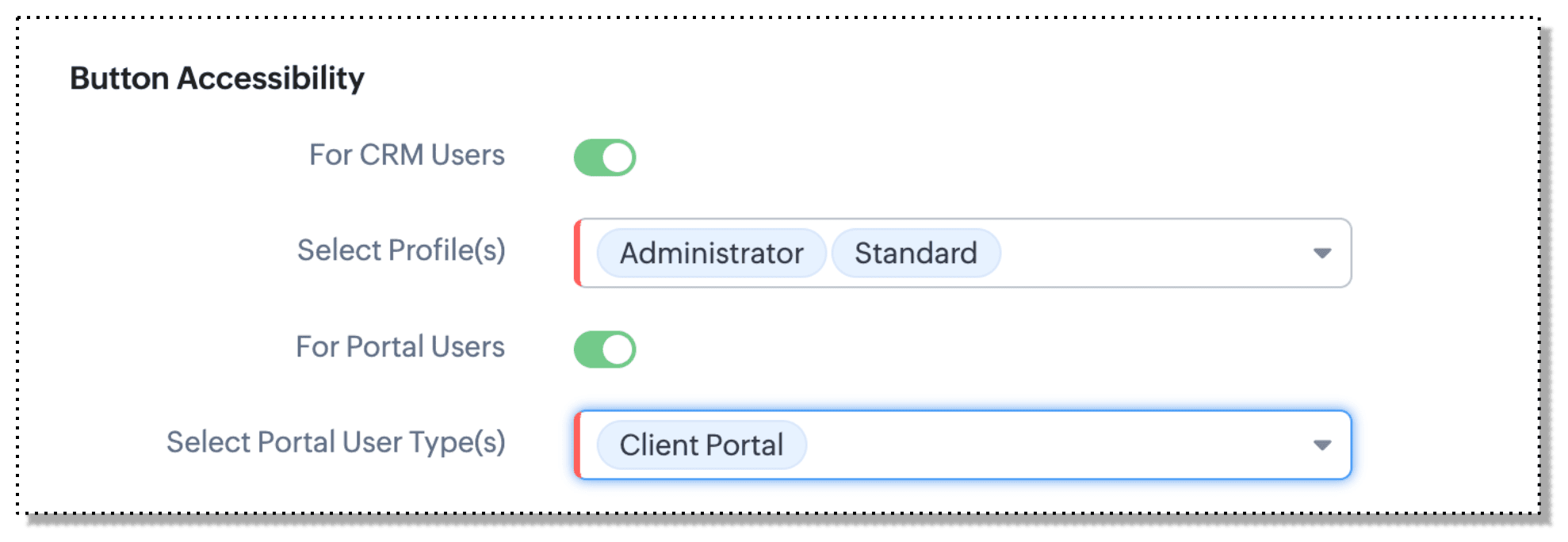 Once the custom button is associated with an action, CRM Administrators can manage permissions by assigning only specific profiles to view and access the custom button.