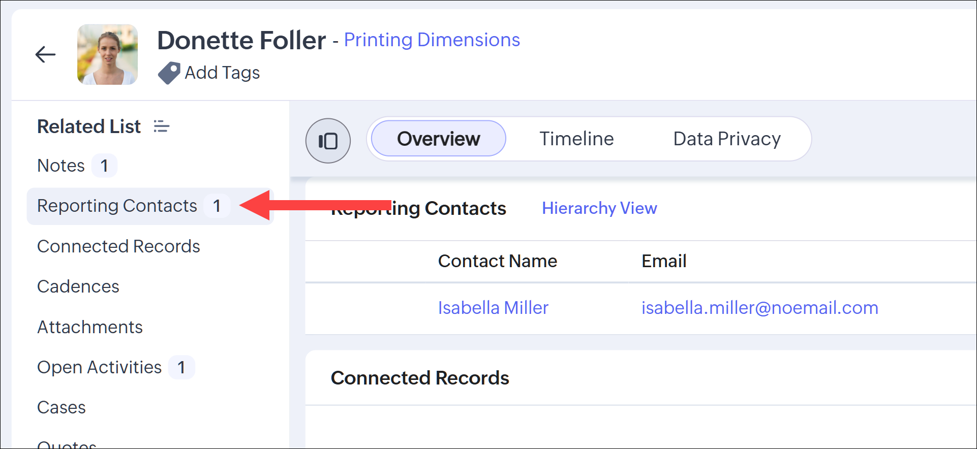 In Contacts module - A related list named "Reporting Contacts" is created that displays the direct reports and the reporting hierarchy structure of the contacts.