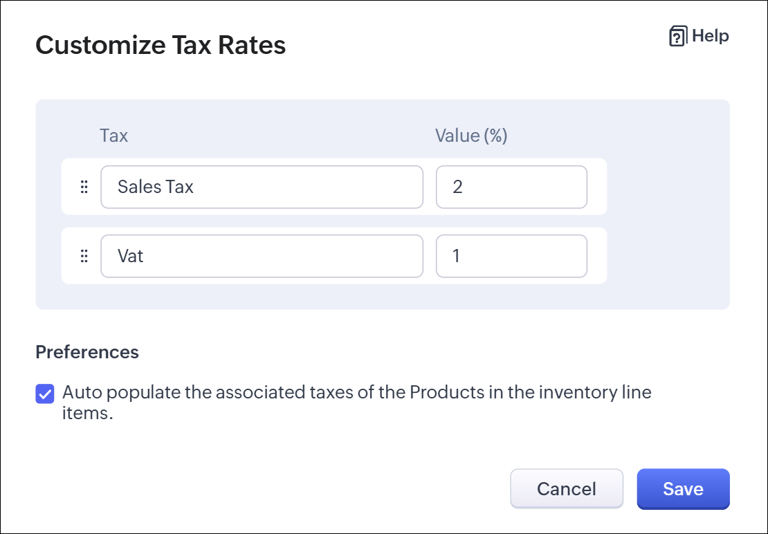 Click and drag the rows around to rearrange their order. - In Preferences, select if you want users to auto populate the associated tax rates.