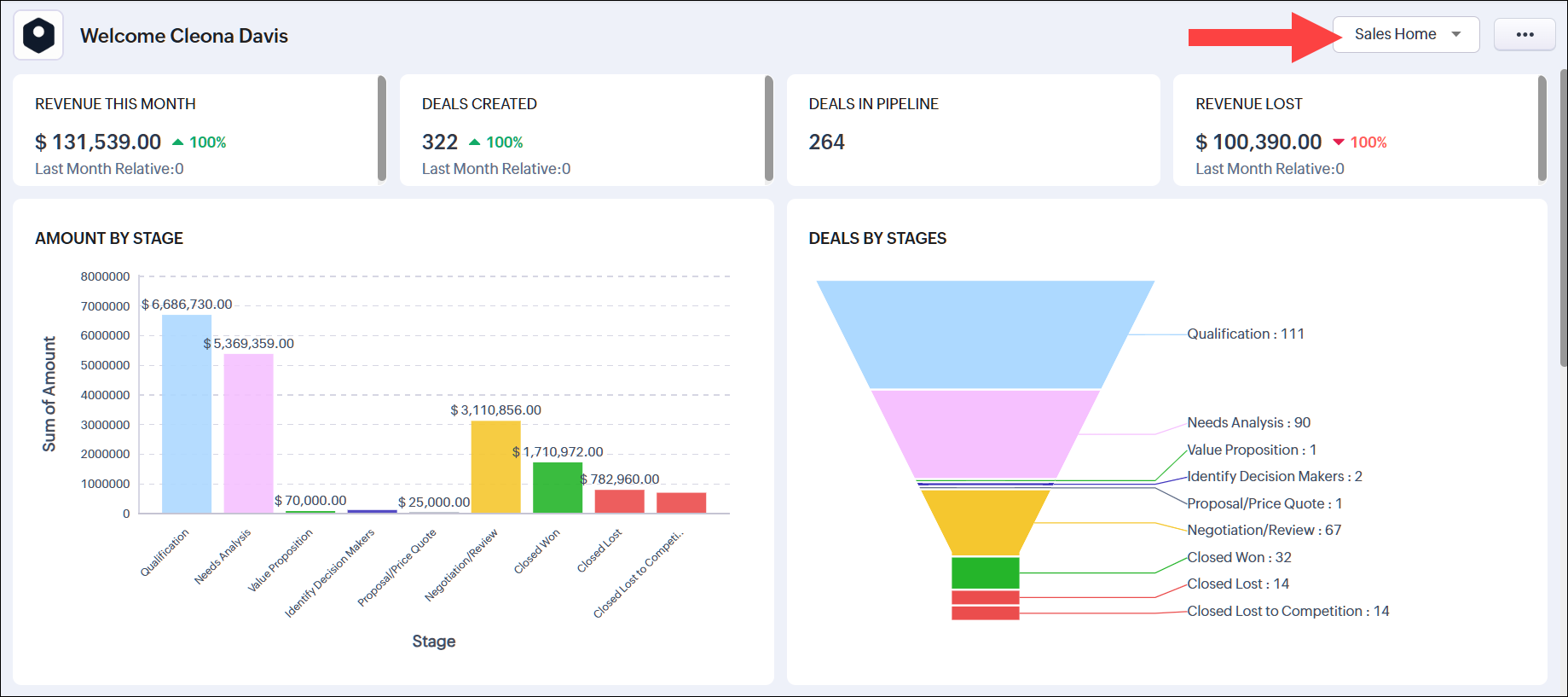 You can customize the Home page for users based on what you want them to look at once they log into Zoho CRM. You can share this Home page with multiple roles or profiles. They can switch to other views when required. Each time they log into the CRM, the last home page that was selected will be displayed.