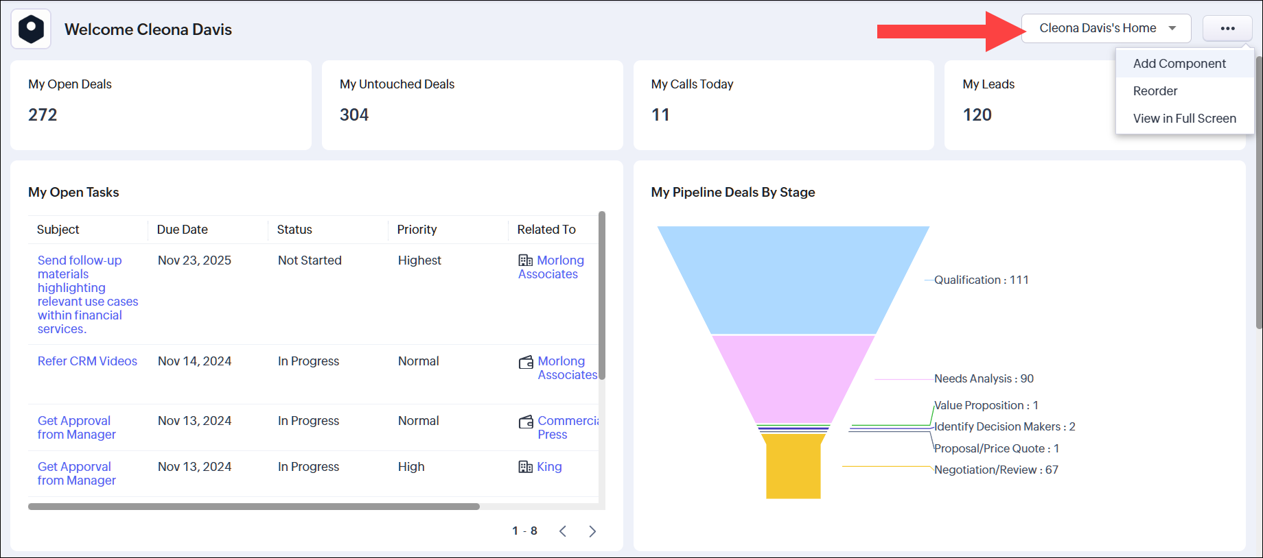 In the User's Home Page, you can add components of your choice. Each component will list data from various others modules like the Leads, Potentials, Dashboards etc.