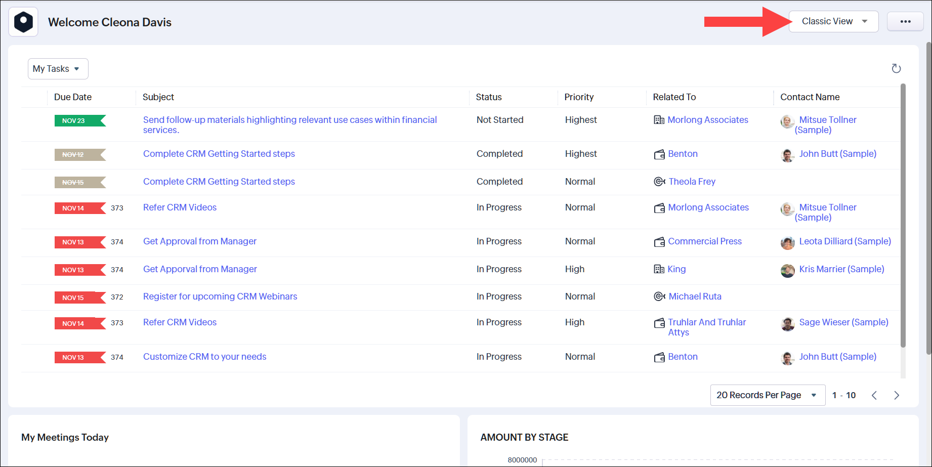 Besides indicating the progress of your CRM activities, the Home tab also serves as a great place to organize your day's work, as well as your teams'. This is possible by means of the four types of "Views" in the Home tab of Zoho CRM.