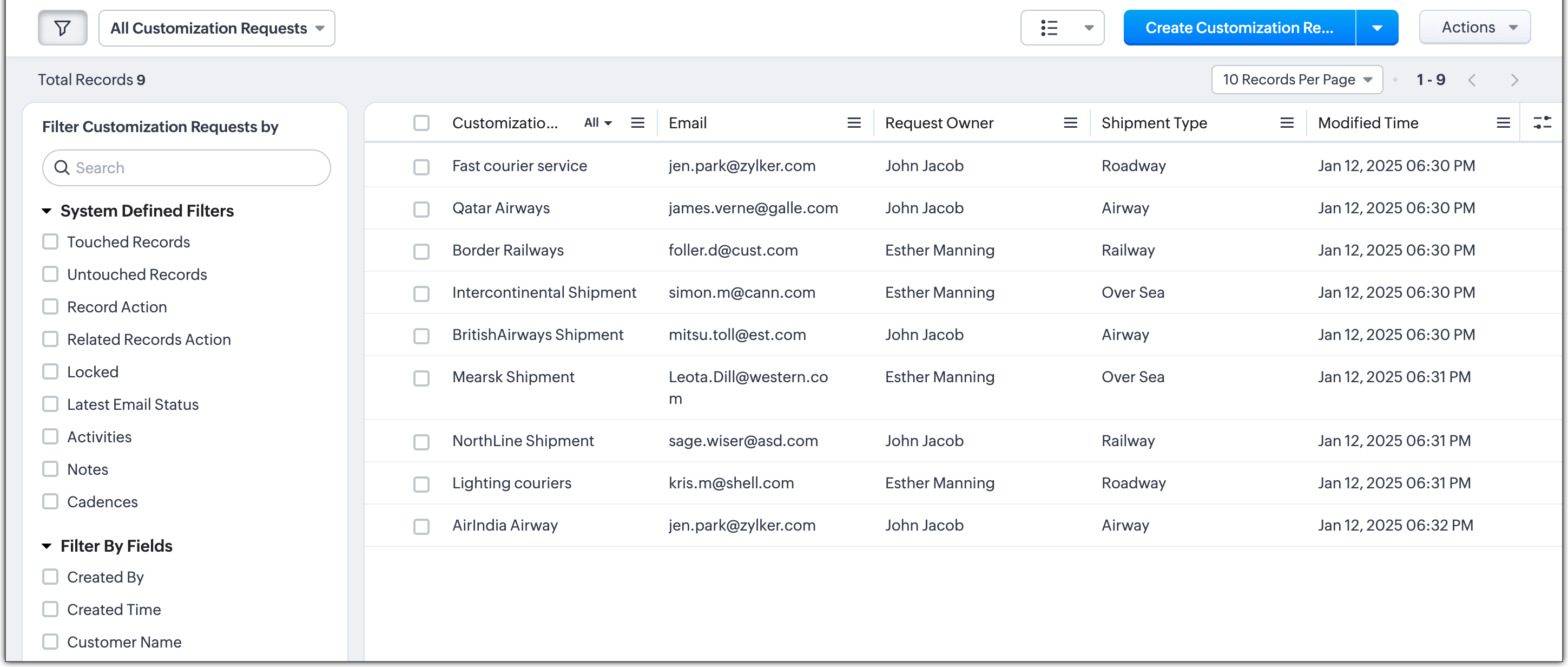 1. Product Customization Requests: Create a module to track and manage customer requests for product changes. Say, ZylkerInc, a start-up specializing in tracking software for shipping industries, uses CRM to manage their business. To cater to their customers' unique needs based on transportation modes—such as road, air, sea, or rail—they can customize their software accordingly. By creating a custom module titled "Customization Requests," they can efficiently track and manage the specific customization requirements submitted by their customers.