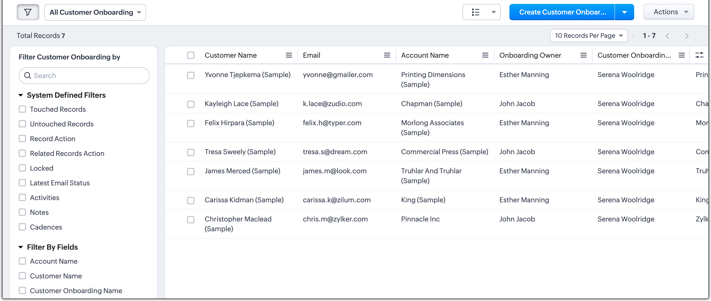 2. Customer Onboarding: Track the onboarding journey of new clients, ensuring all necessary steps are completed efficiently. Let’s take the example of Zylker Enterprises, a software start-up renowned for its tracking software. With a high volume of new customers signing up for accounts, they need an efficient way to manage onboarding requests. By creating a custom module named "New Customer Onboarding," they can effectively track and support customers as they begin using the software, ensuring a smooth and seamless onboarding experience.
