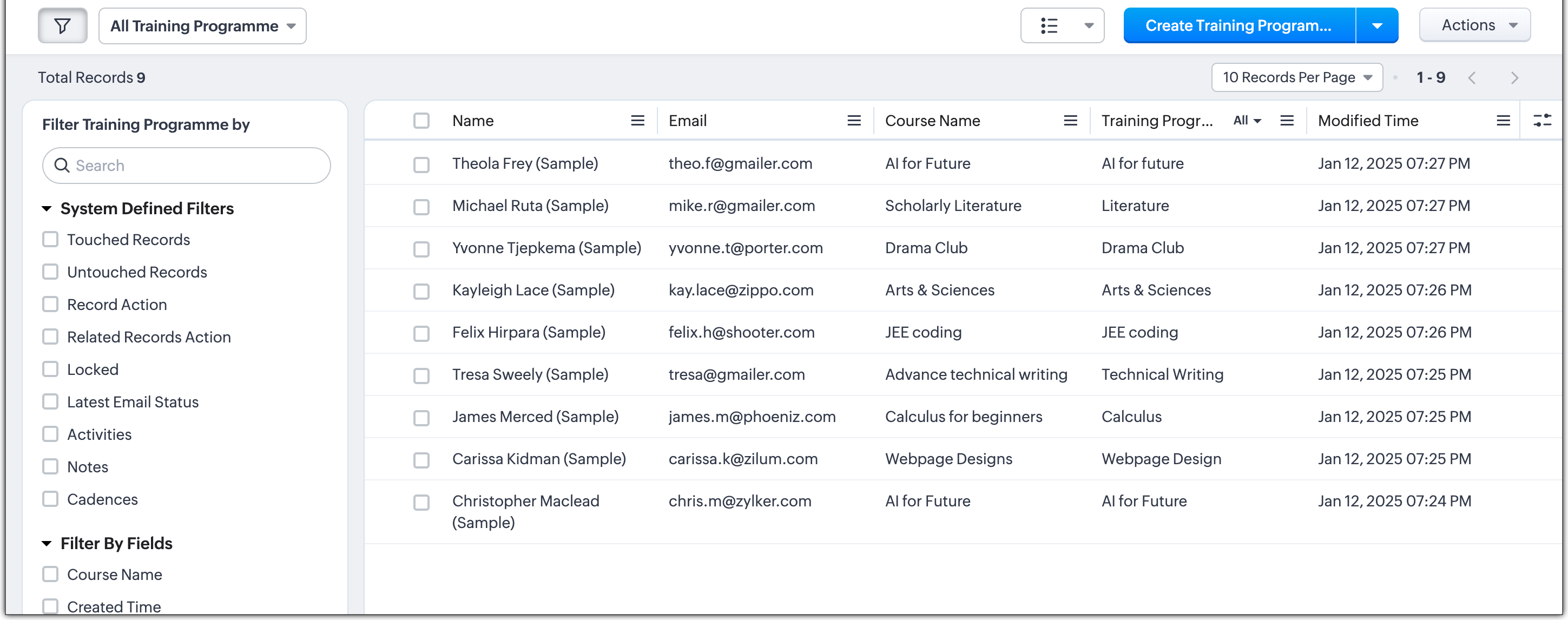 4. Education-based Institutions: Use a custom module to manage education-based processes like training programs, student progress, and course feedback. Highland School of Business Management, which uses Zoho CRM for its educational operations, can greatly benefit from this functionality. By creating custom modules, they can streamline processes related to teachers, students, courses, and training programs. For example, they can maintain organized records for their list of teachers, students, and courses. Additionally, custom modules enable them to efficiently plan, organize, and track training programs for both students and teachers, ensuring seamless management of their educational initiatives.