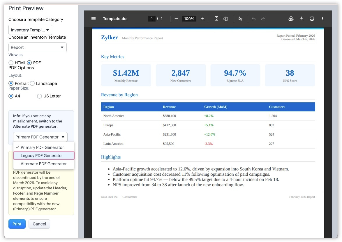 All you need to do is review and edit the header, footer, and page number tags in the HTML of the inventory templates to the supported format. After saving the template, generate a PDF of it to check the alignment by switching to the new PDF generator.