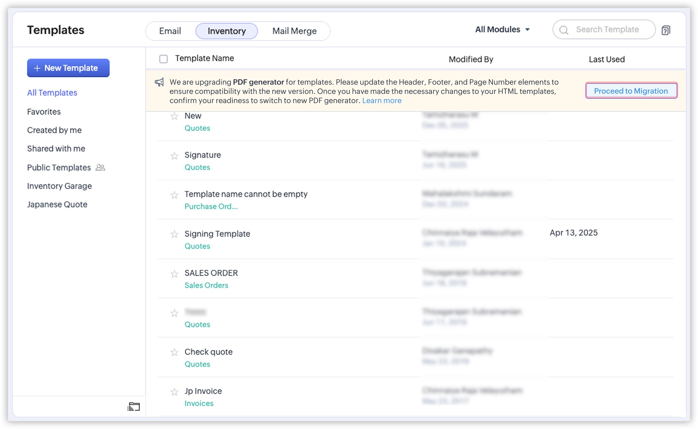 After completing all the steps, you can begin the migration to the new PDF generator by clicking the Proceed to Migration button on the Inventory Templates page. This option is available to all administrators.