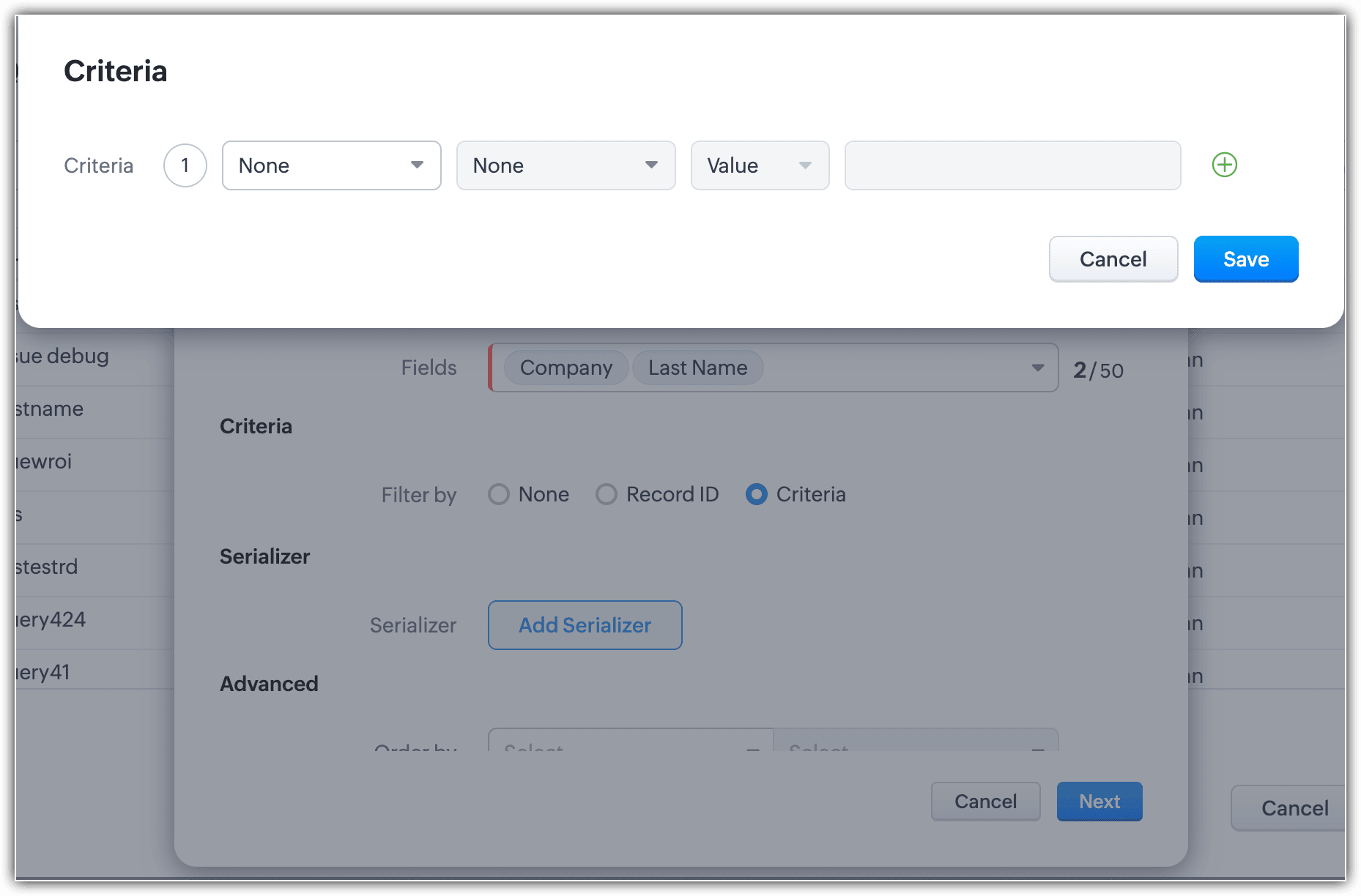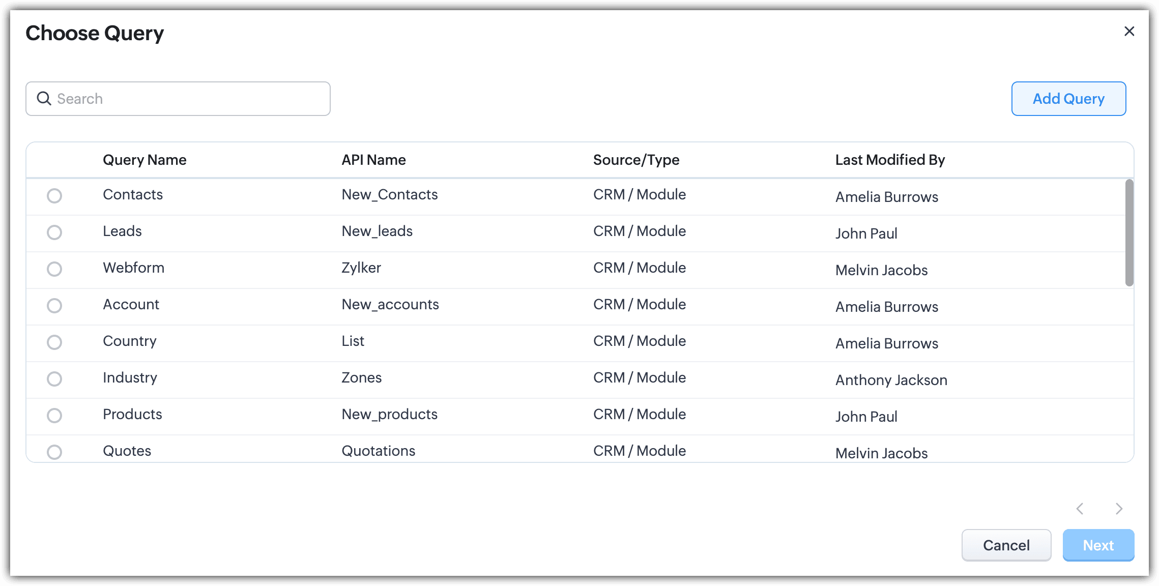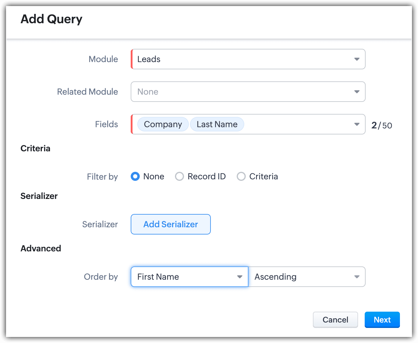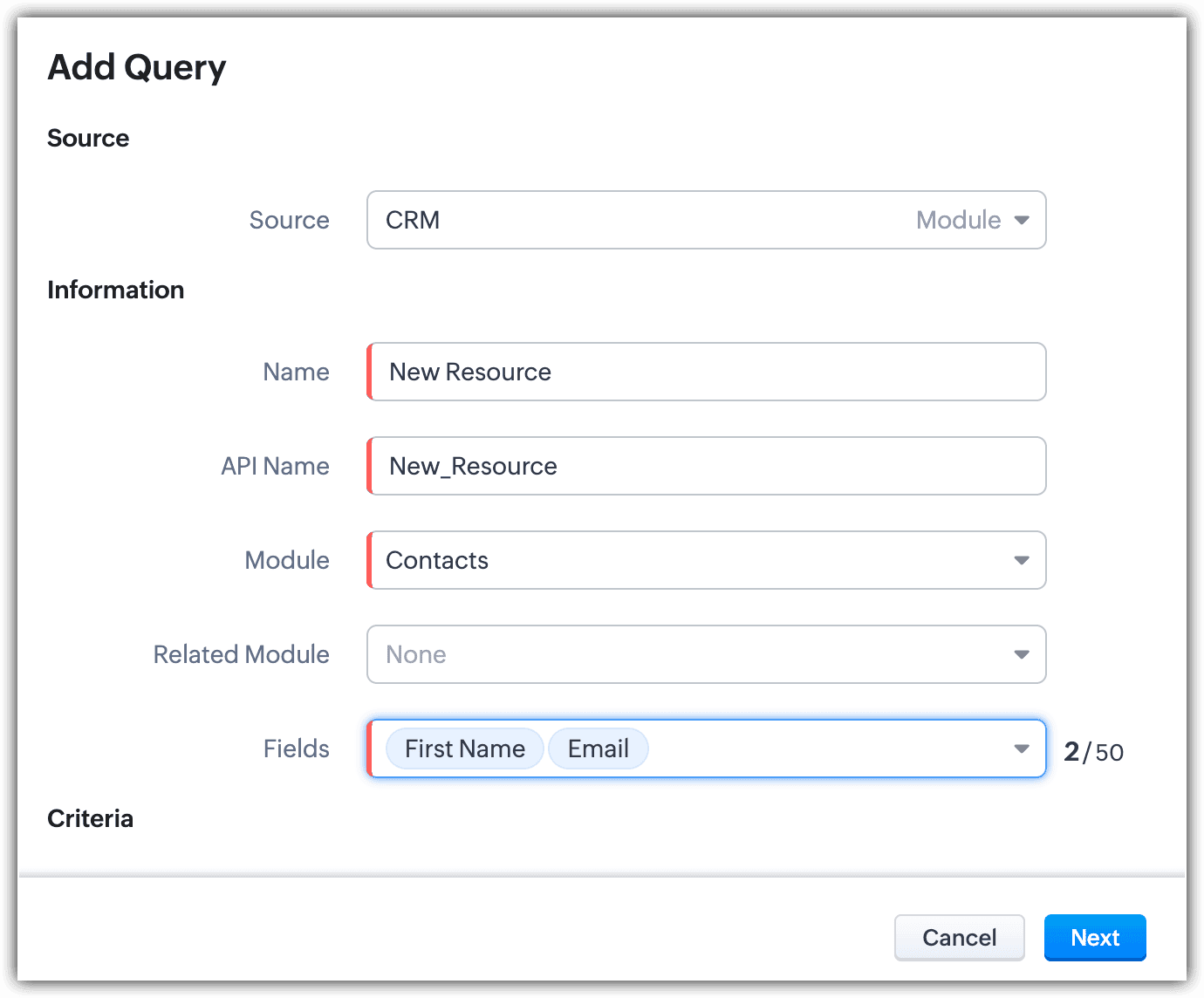 -- Information : Enter the query name; the API name will automatically be filled. Select the module and related module if needed and choose the fields.