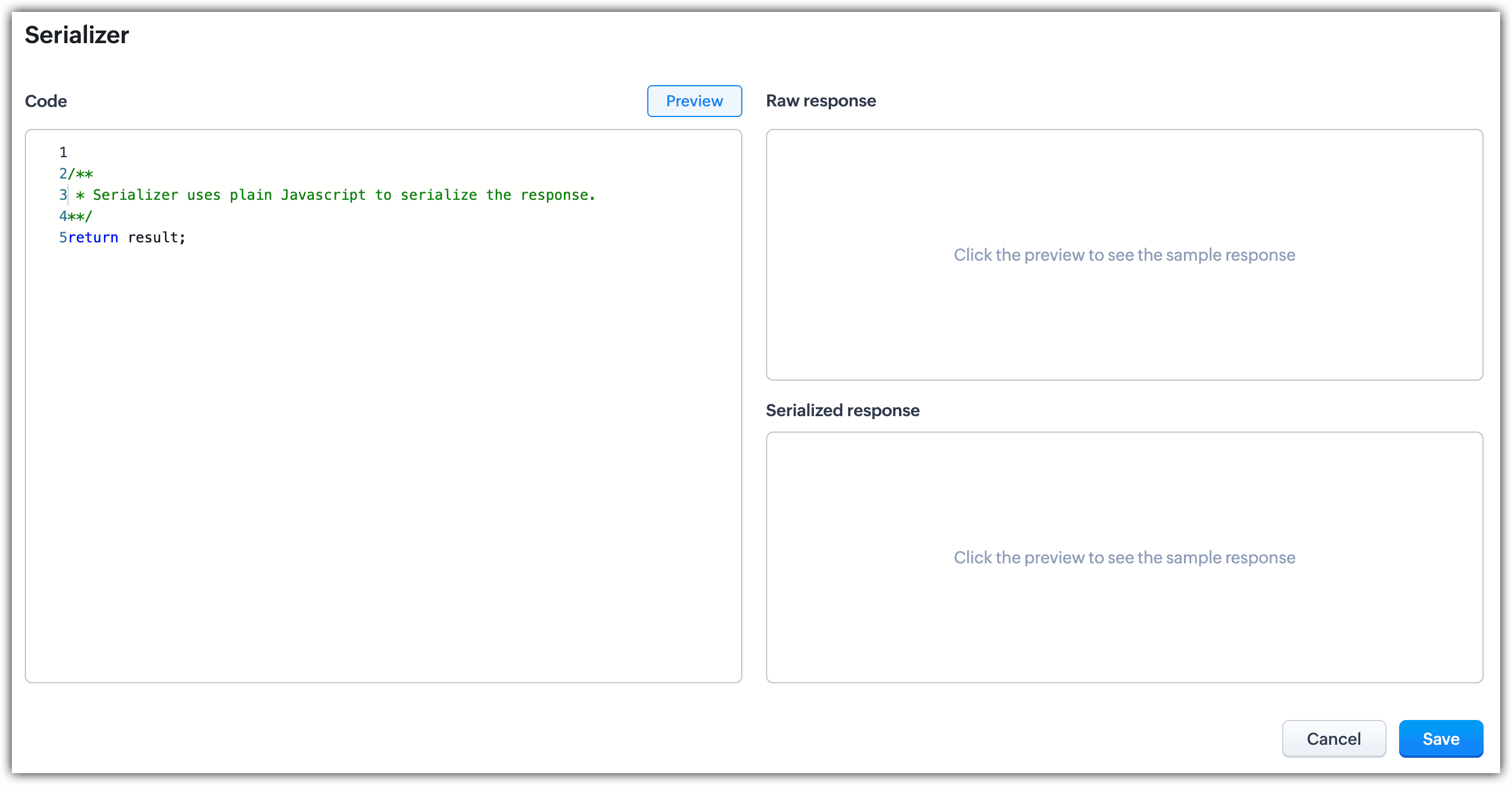 -- Serializer : Serializer lets you modify your response using JavaScript to use it for further processing. Enter the serializer and click Save.