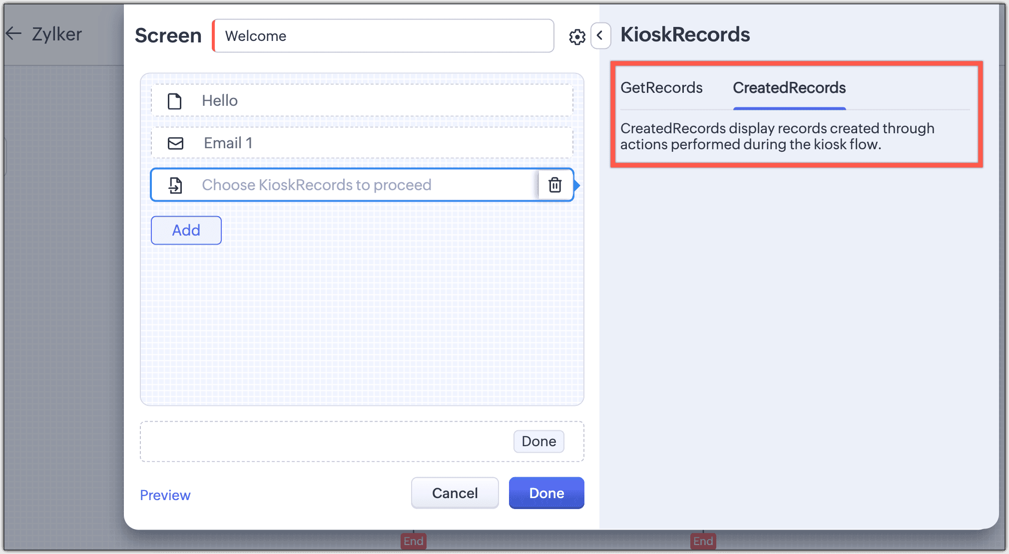 Similarly, you can use CreatedRecords in various action components in Kiosks.