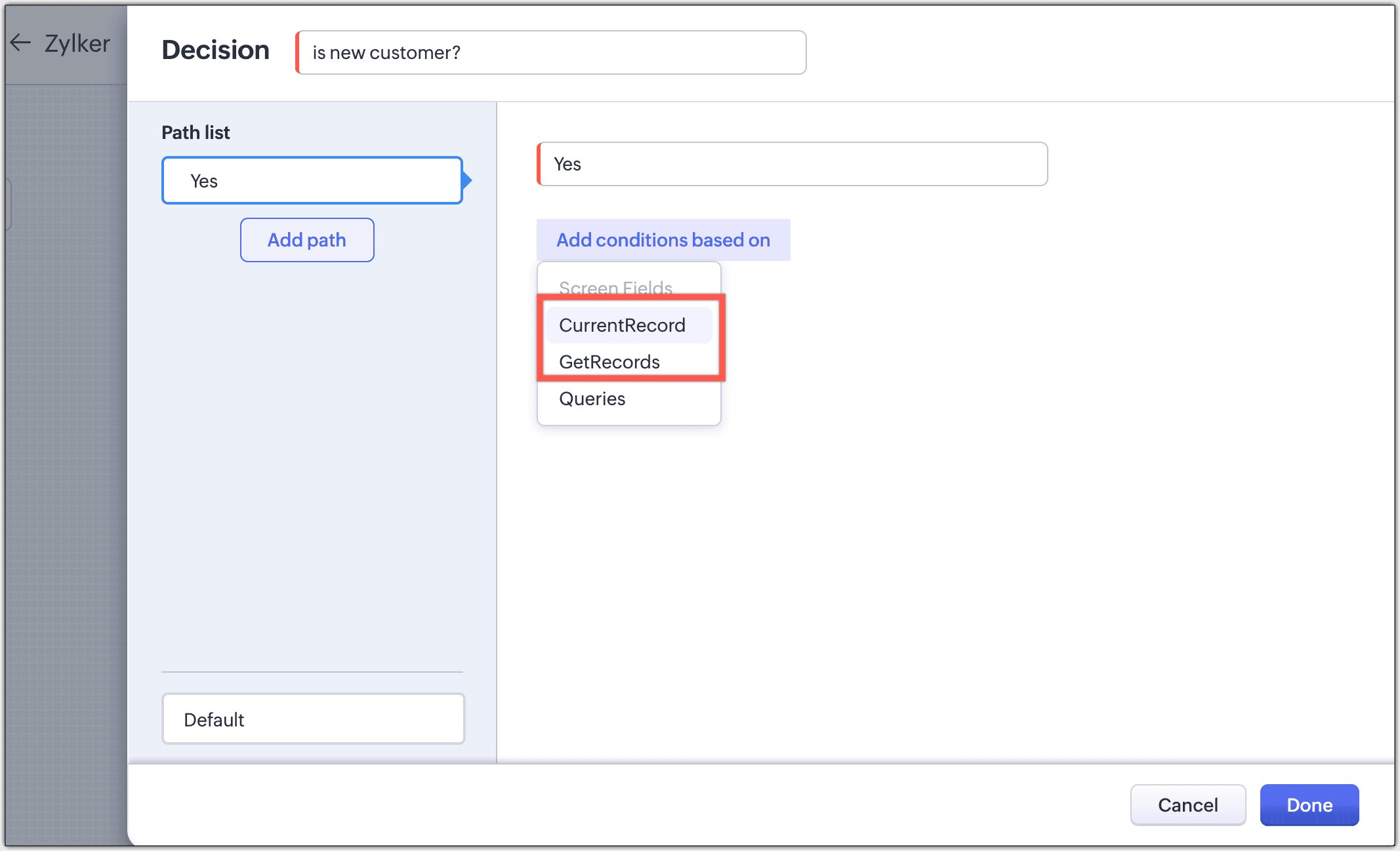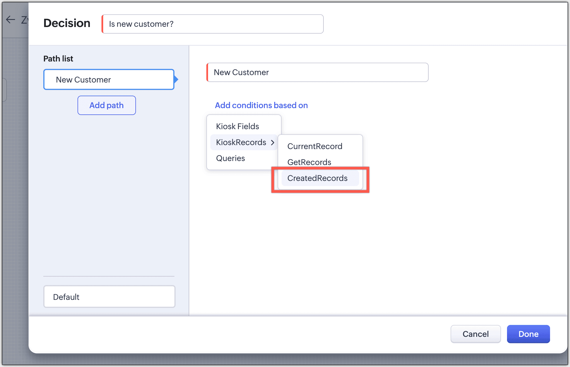This component lets you pull records created through actions in your Kiosk flow. You can configure the decision component by adding conditions based on CreatedRecords, GetRecords and CurrentRecords.