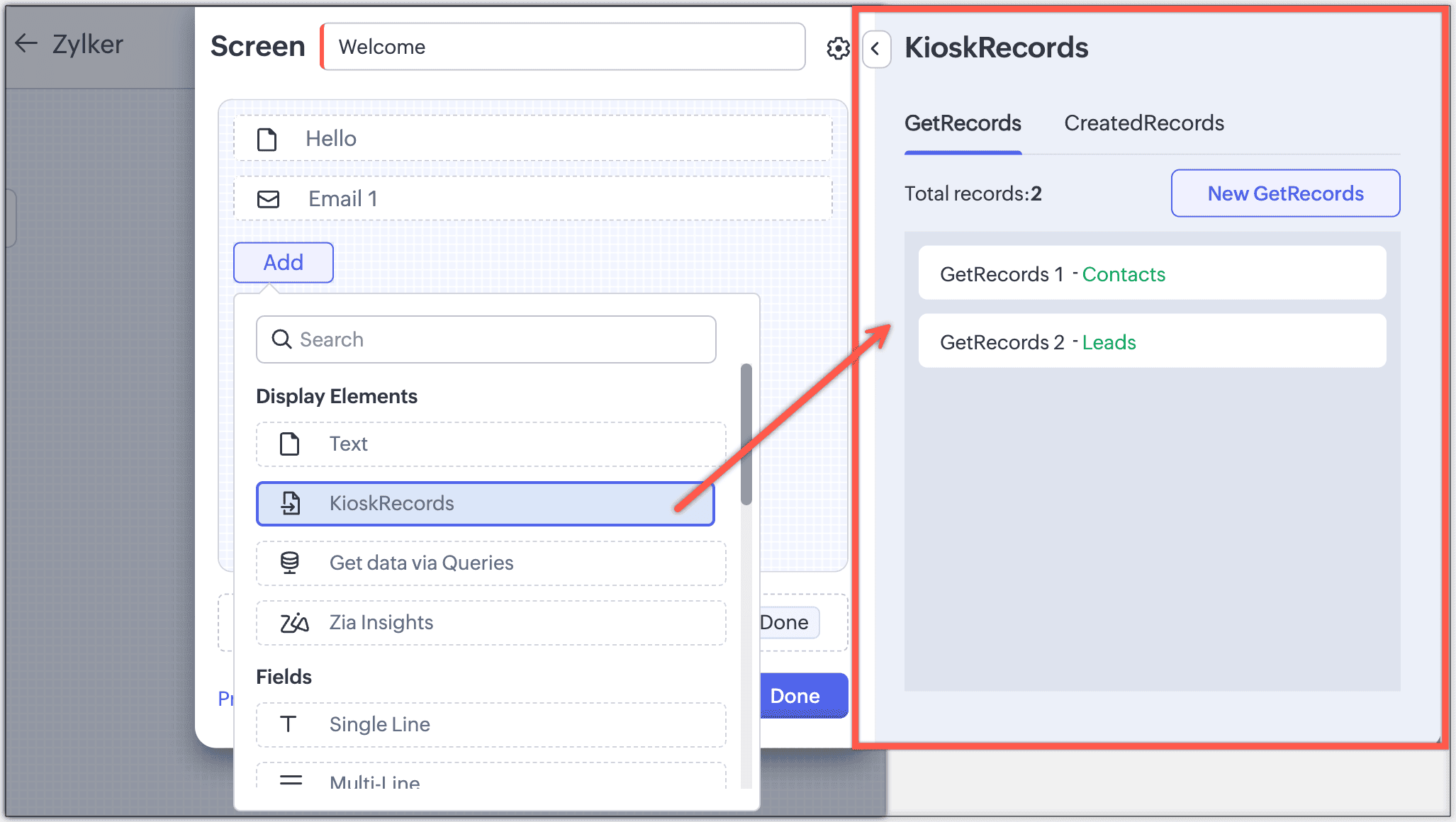 This component lets you pull in records from your CRM or from records created via your Kiosk and display them to users. This component clubs GetRecords, CreatedRecords and CurrentRecords making it easy for users to setup their Kiosks.