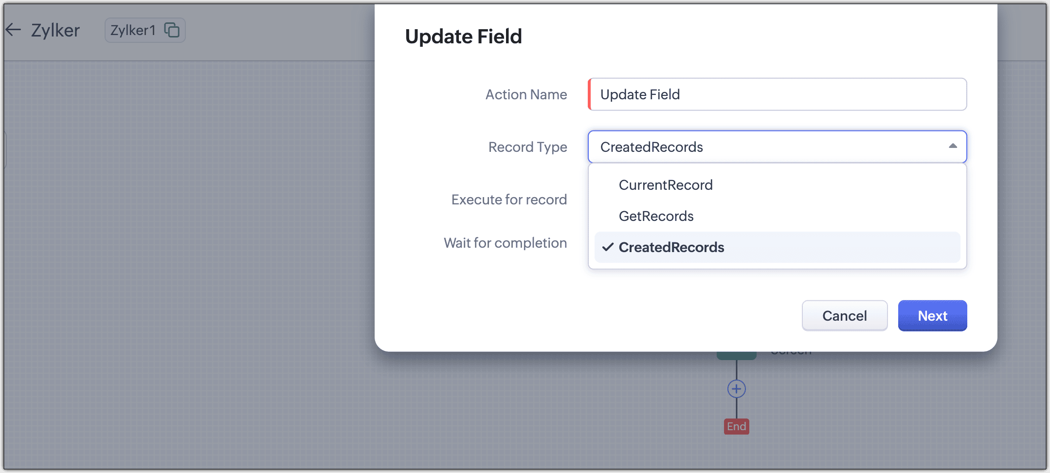 Say, you want to update a field in the created record, you can configure the Update Field action, select the CreatedRecords as record type and configure which field needs to be updated.