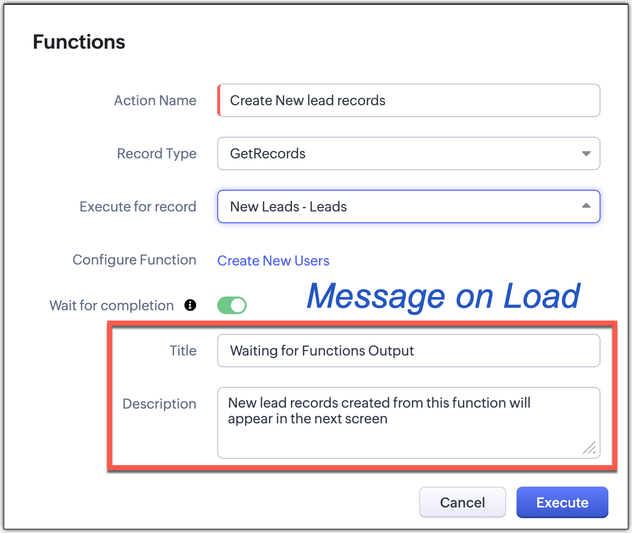 For actions such as Webhooks and Functions you can choose to display a customized message to users while sequential actions are being executed. Since, Webhooks and Functions provide real-time responses, there will be a wait for those responses to be captured. We allow users to provide a message to users during this wait period while the responses are being fetched.