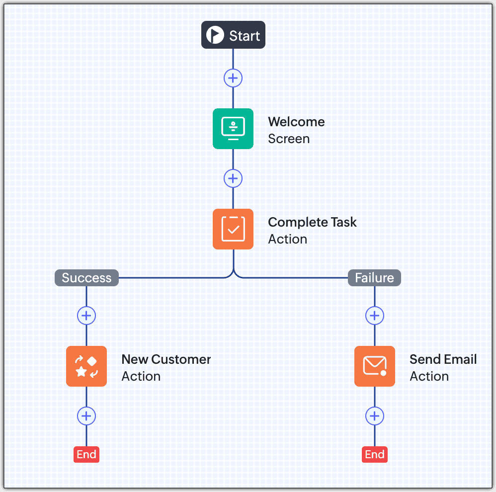 Enabling sequential actions for Kiosks will give users the choice to add a failure path if needed. This is optional and is visually different from the success path as shown in the screenshot below.