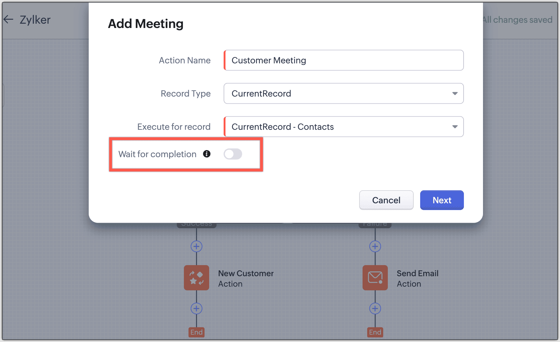 - By default, most actions will have this option automatically enabled. Those actions for which this option needs to be manually enabled are : Activities(Tasks/Calls/Meetings), Create Record, Webhook and Functions.