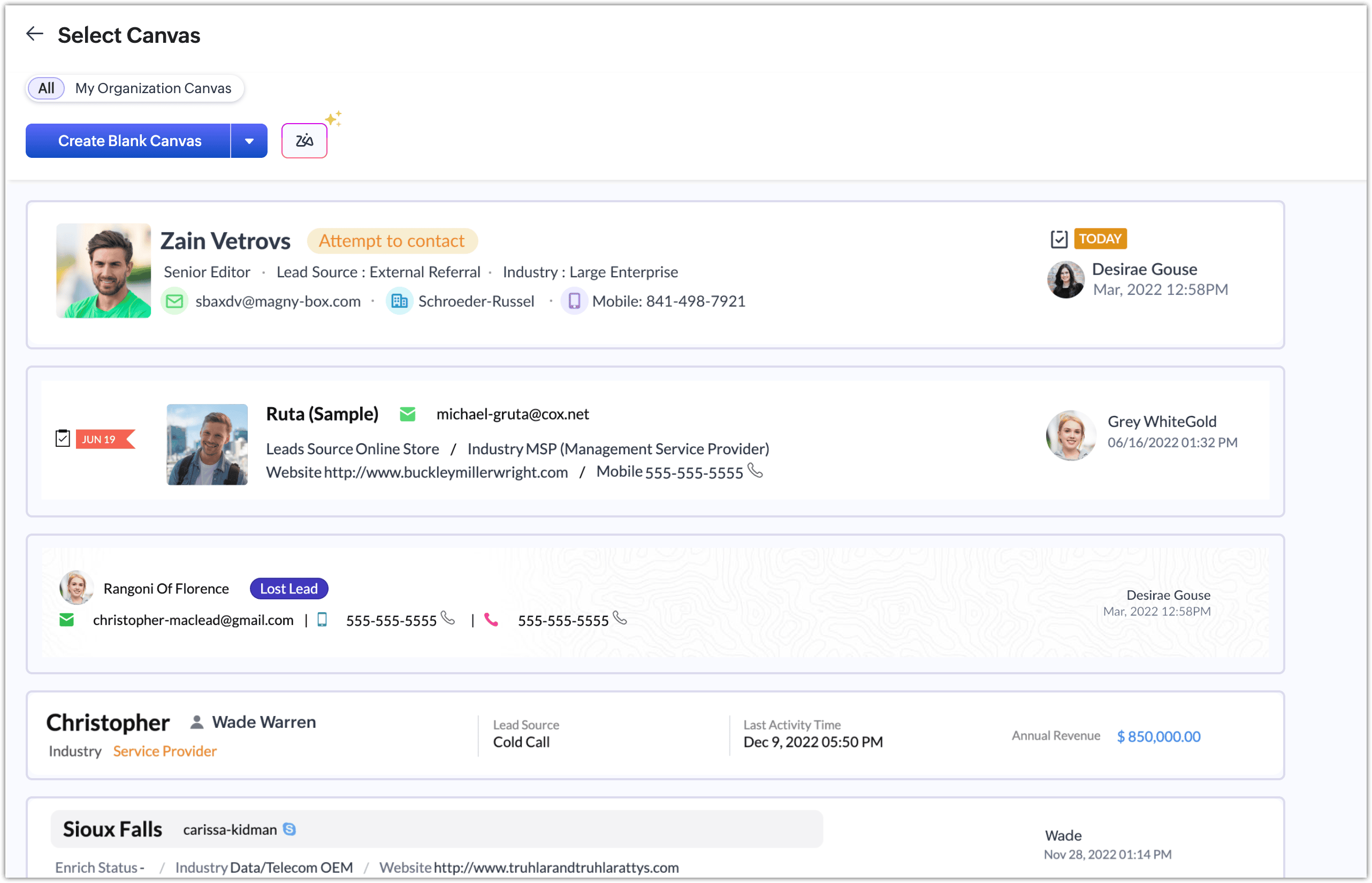 Canvas is Zoho CRM's cutting-edge design studio that enables you to create and present your data in a more organized way. It's loaded with sophisticated design elements that are simple to view and straightforward to use.