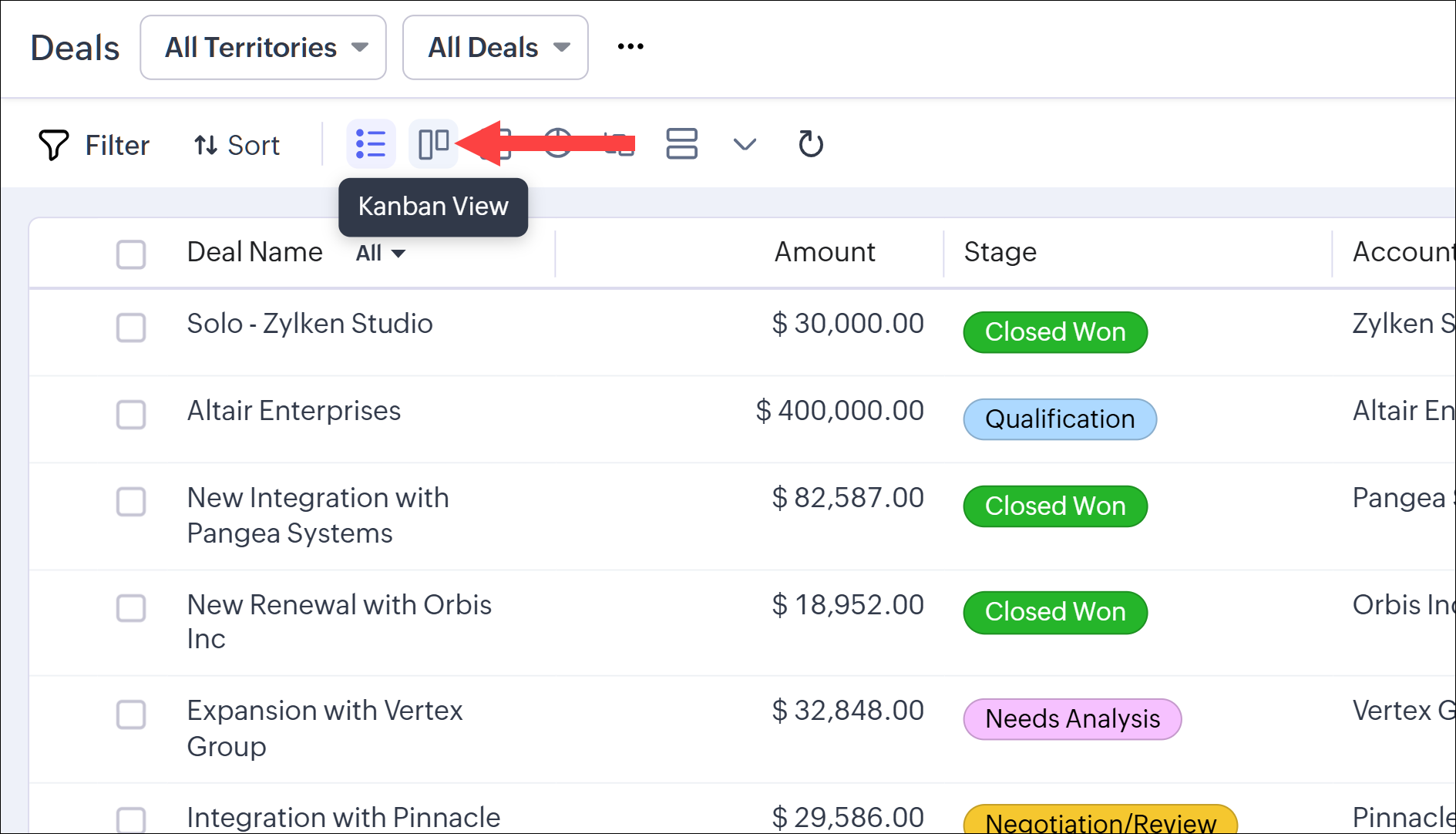In comparison to List View, where all the records are listed one after the other, a Kanban view segregates your data based upon the lead status giving a clearer picture. You can also view the aggregate revenue under each status. You can create such kanban views for all modules except Socials, and Visits.