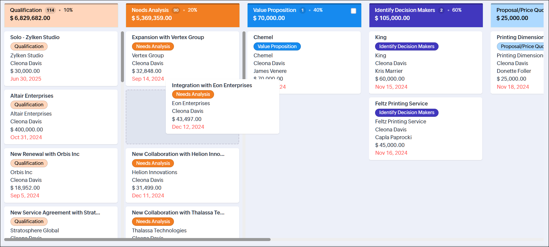 Creating a Kanban view will give you precise information about all the records at one click. You can create a Kanban view for all the modules except activities, visits and finances.