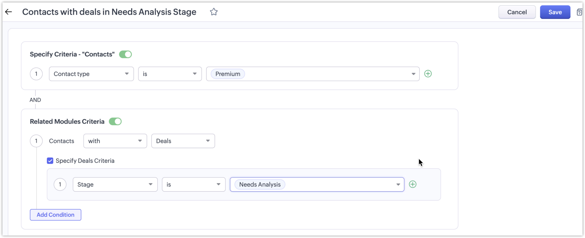 Let’s say a user wants to create a view based on the Deals module from within the Contacts module. They could set some of the following criterias: