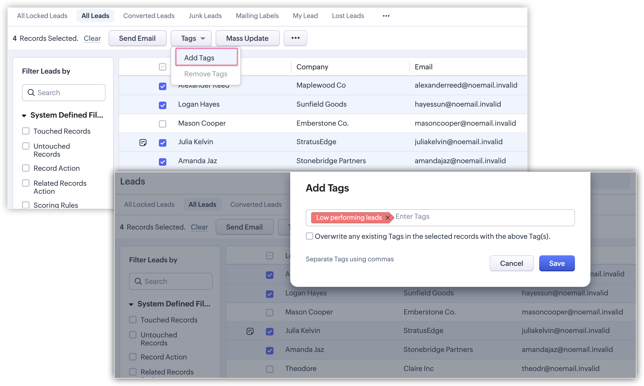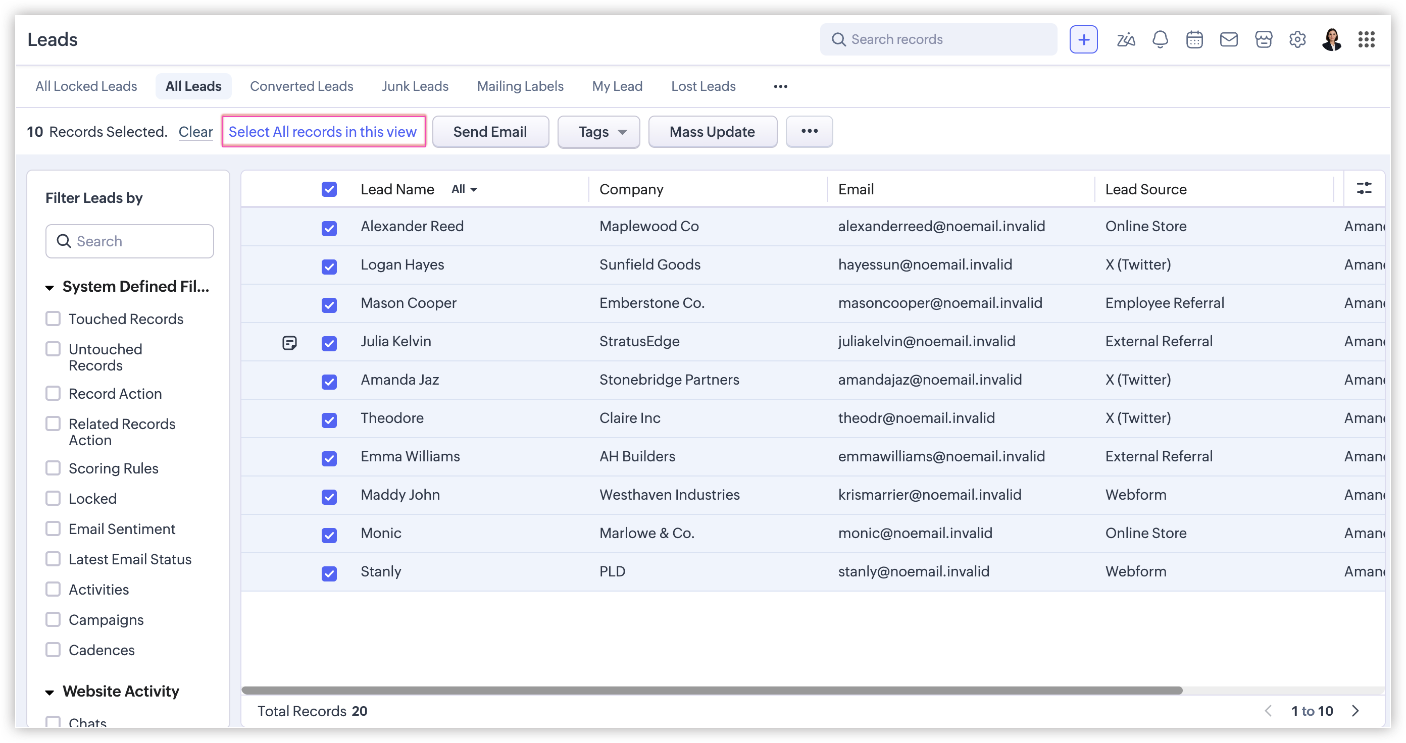 Sending emails to leads and contacts