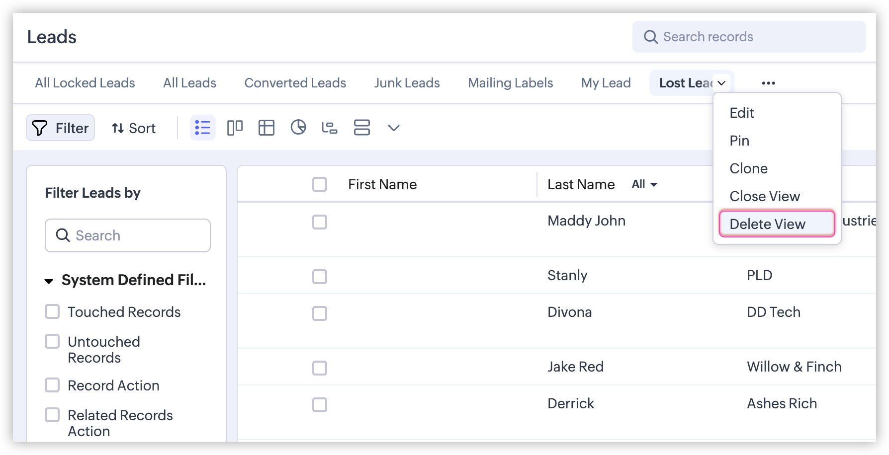 In the "Are you sure you want to delete the "Lost Leads" Custom View?"pop-up, click Delete.