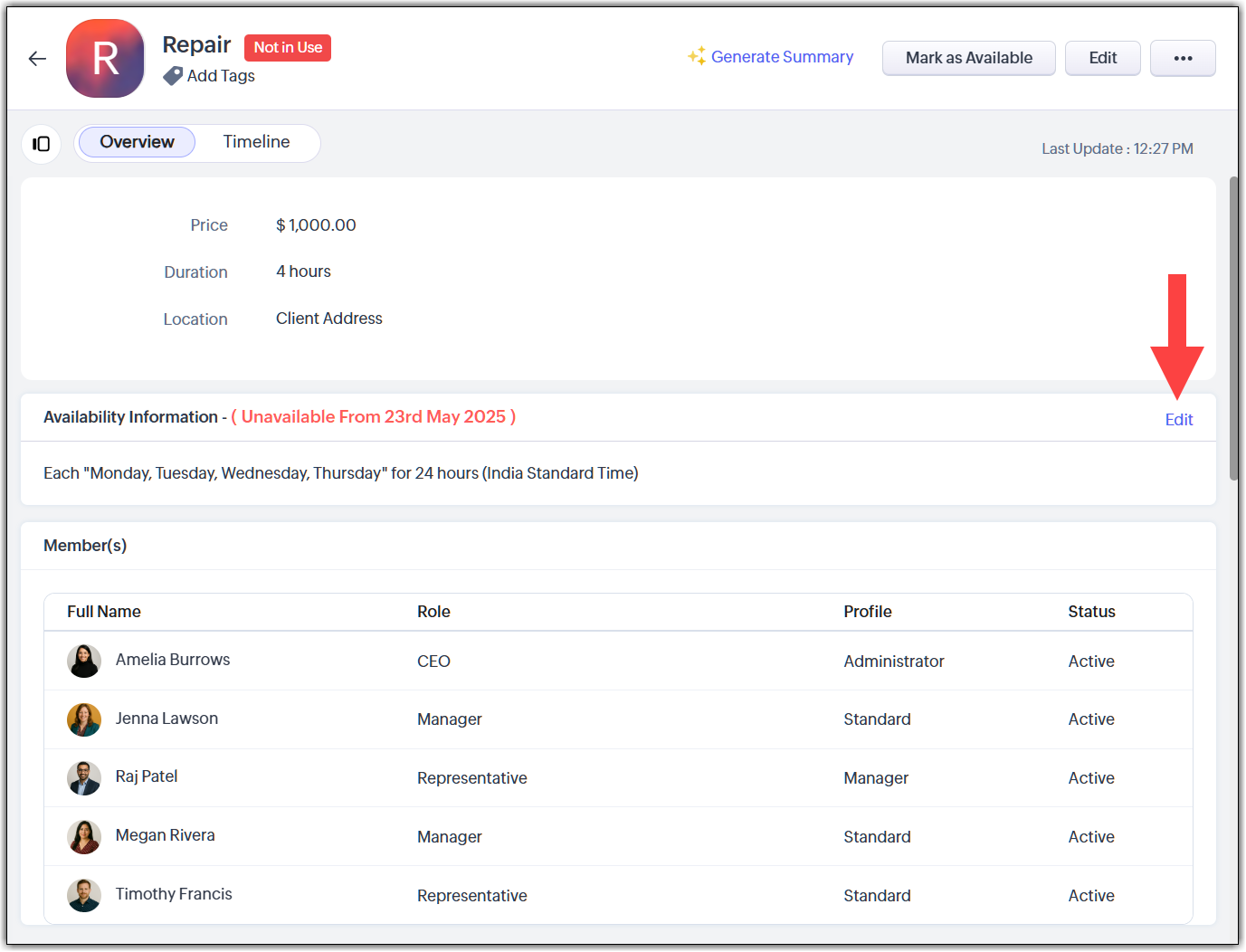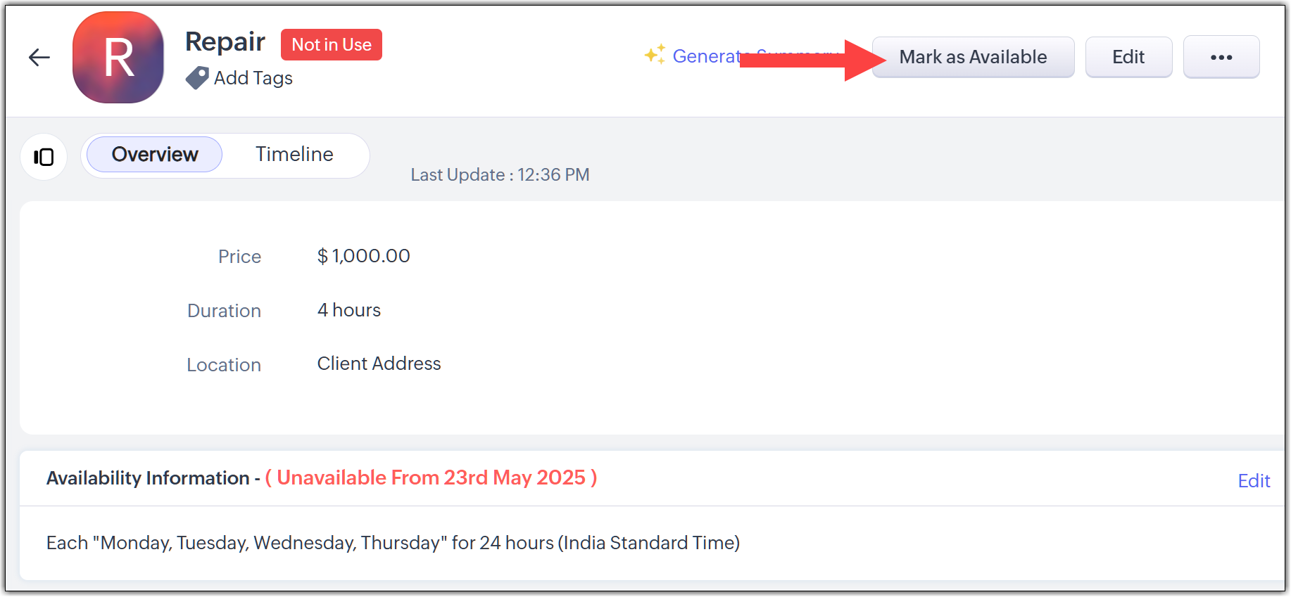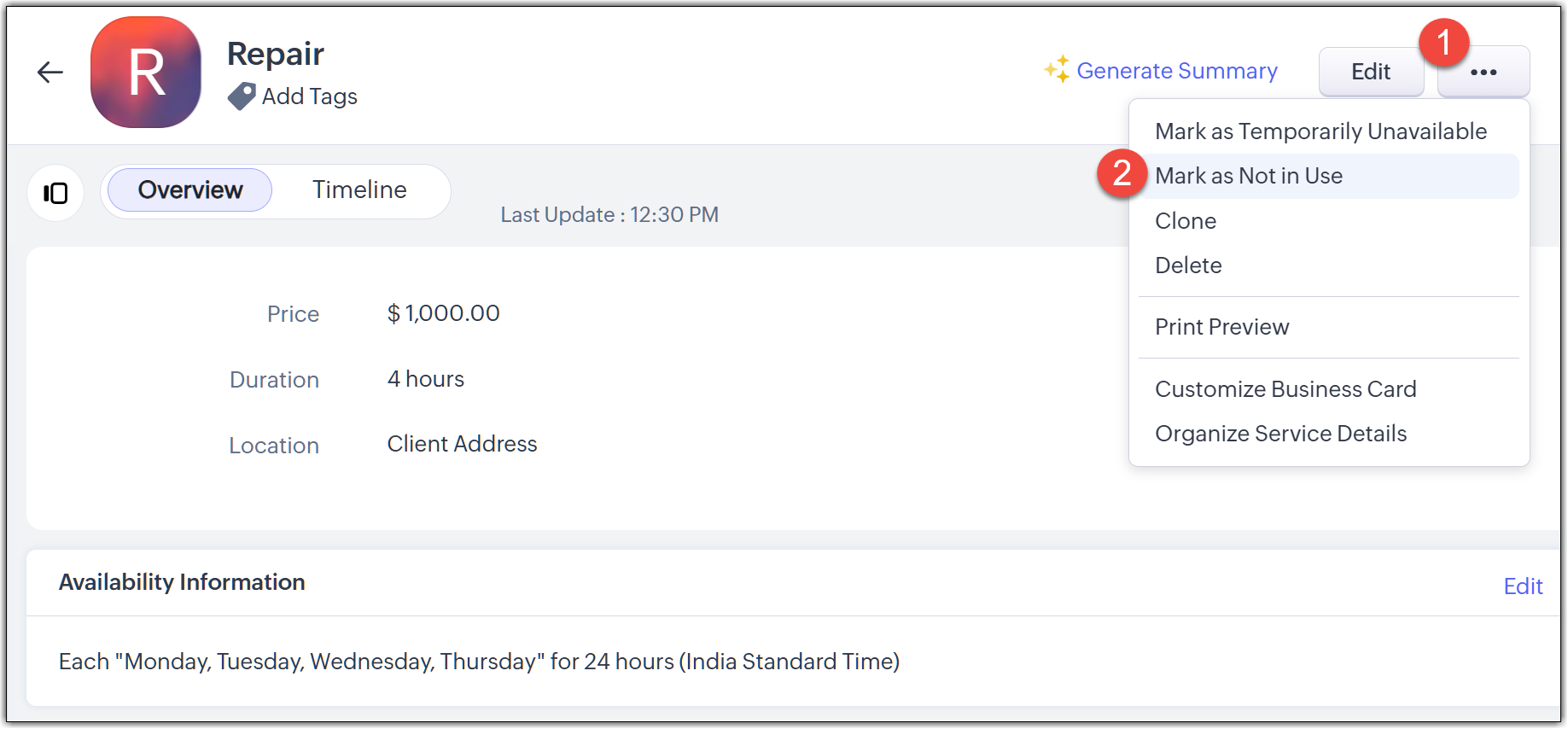 You can mark a service as not in use so your employees know it is not available. These services will not be listed when appointments are booked.You can mark the service as available again from the record detail page whenever you want.