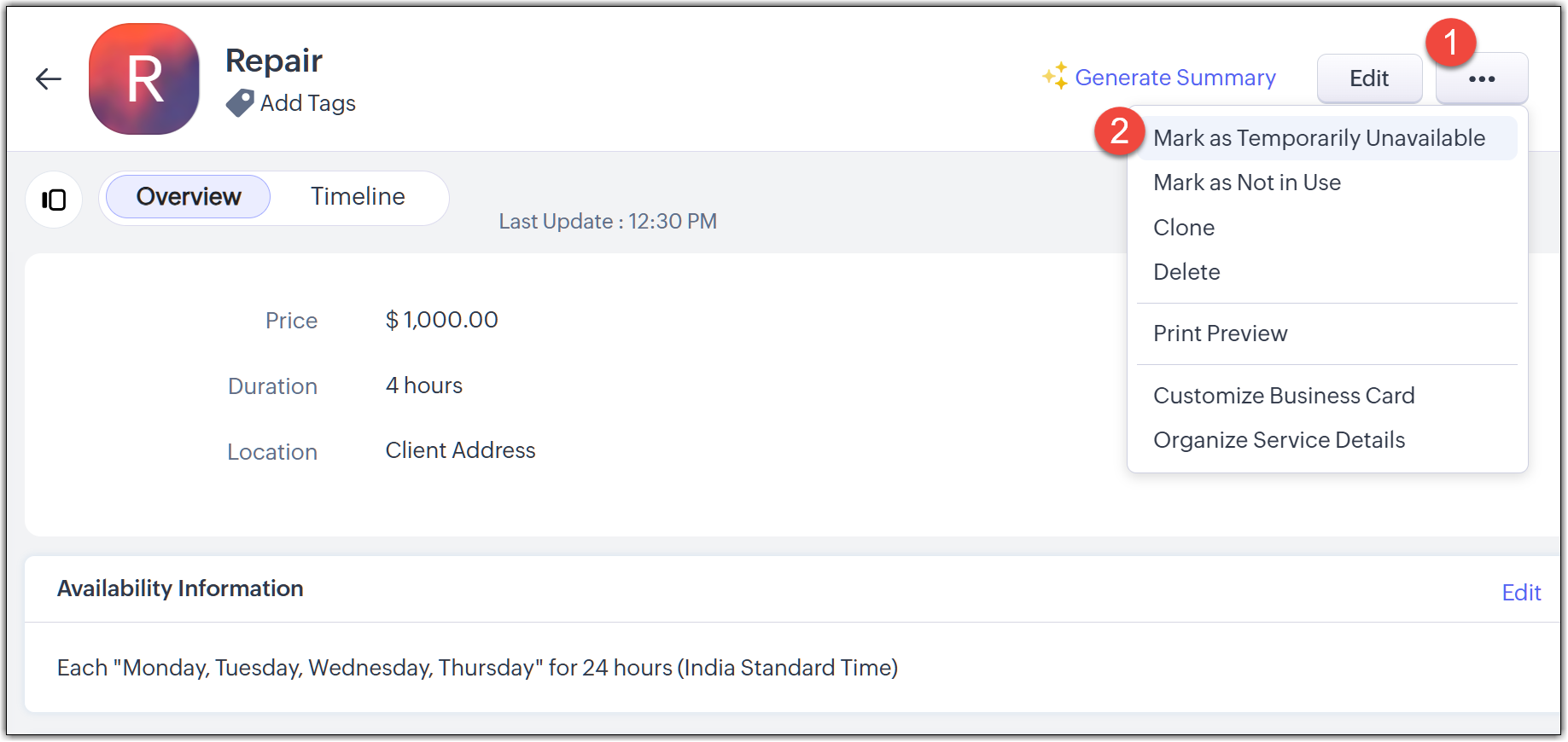 - Click the More icon and select Mark as Temporarily Unavailable.