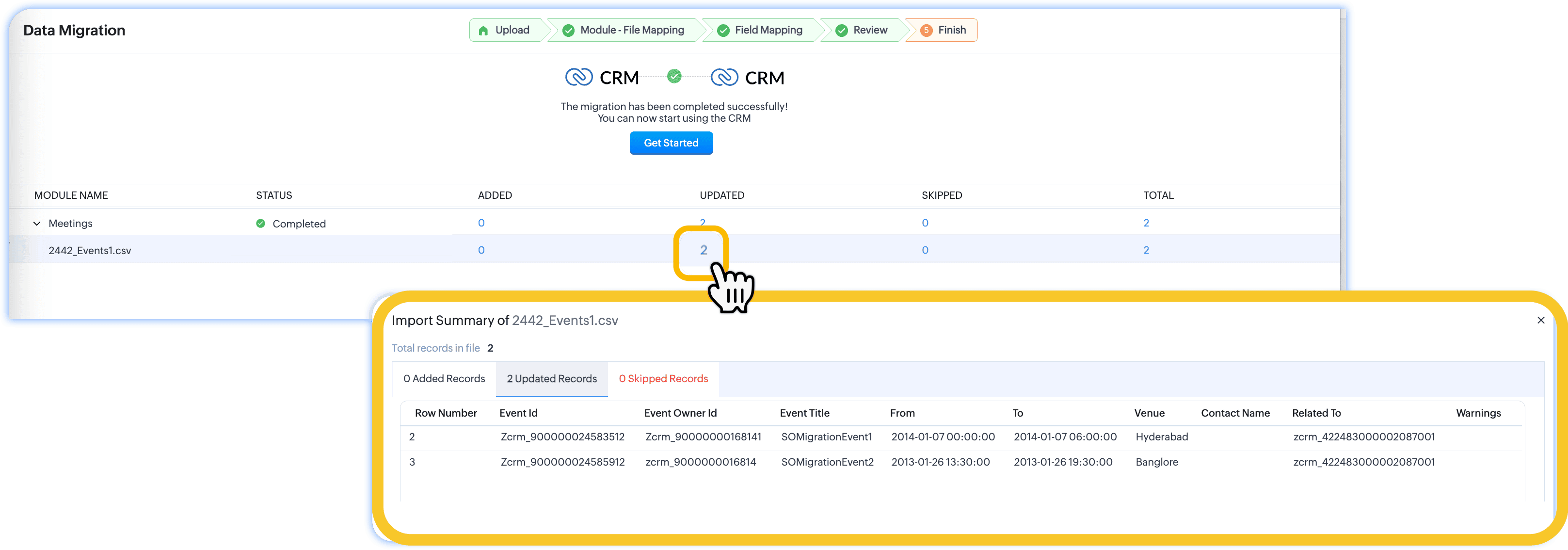 The summary page shows module name, its status, number of files added, updated, skipped, and total migrated files for each module. These aren't mere numbers. Imagine you haven't mapped a field or there are a few data skipped by the system; you can click on the number corresponding to the module and the status to view the number of records in that status. With this, you can start using Zoho CRM, confidently.