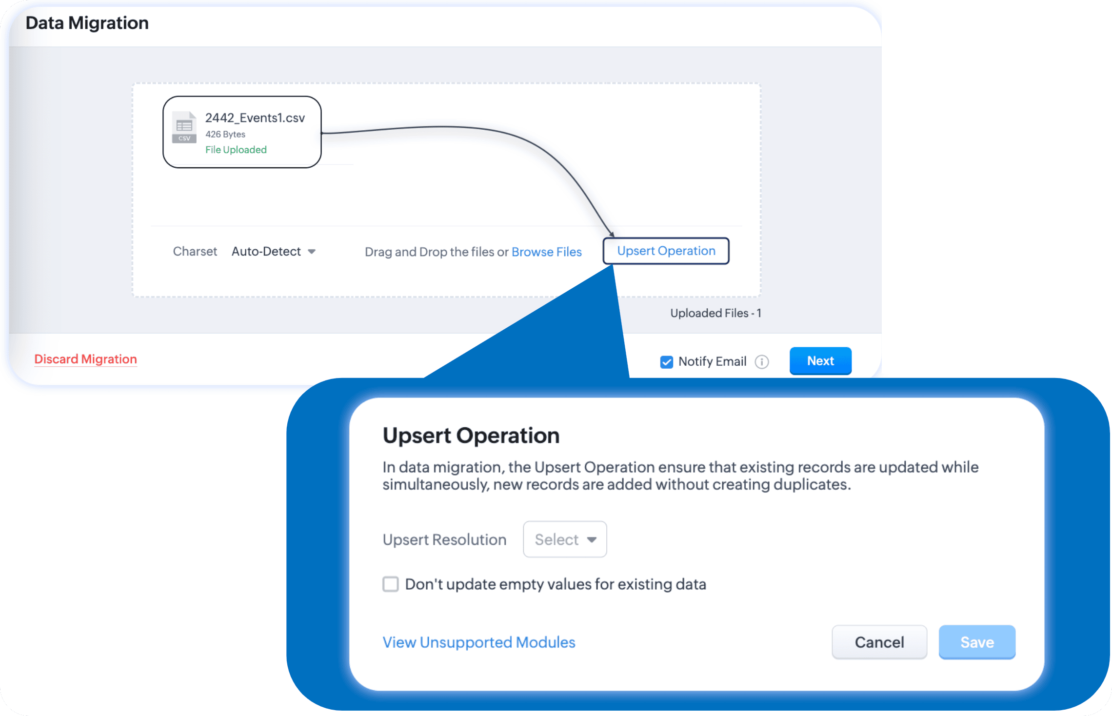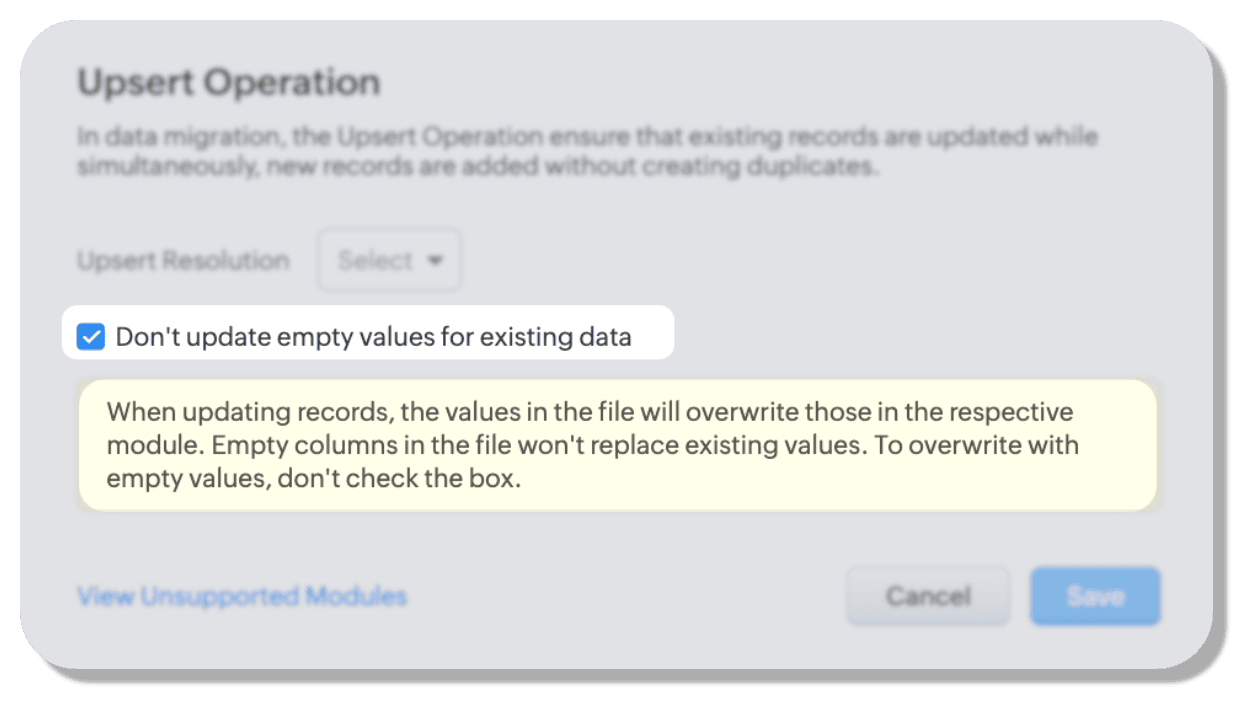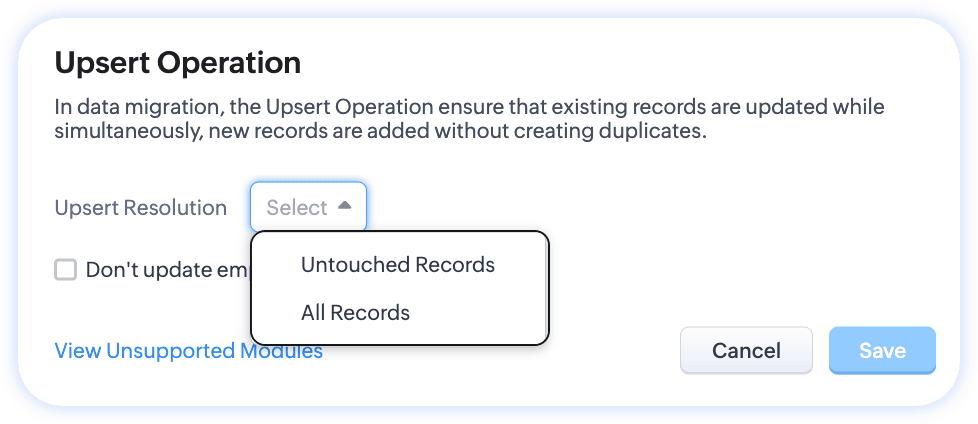 - After migration is complete, if you have started using Zoho CRM and make changes to records, then those changes are the most recent and hence could be considered more accurate. If so, you can select 'untouched' during upsert which will only modify those records which have not been touched after migration.