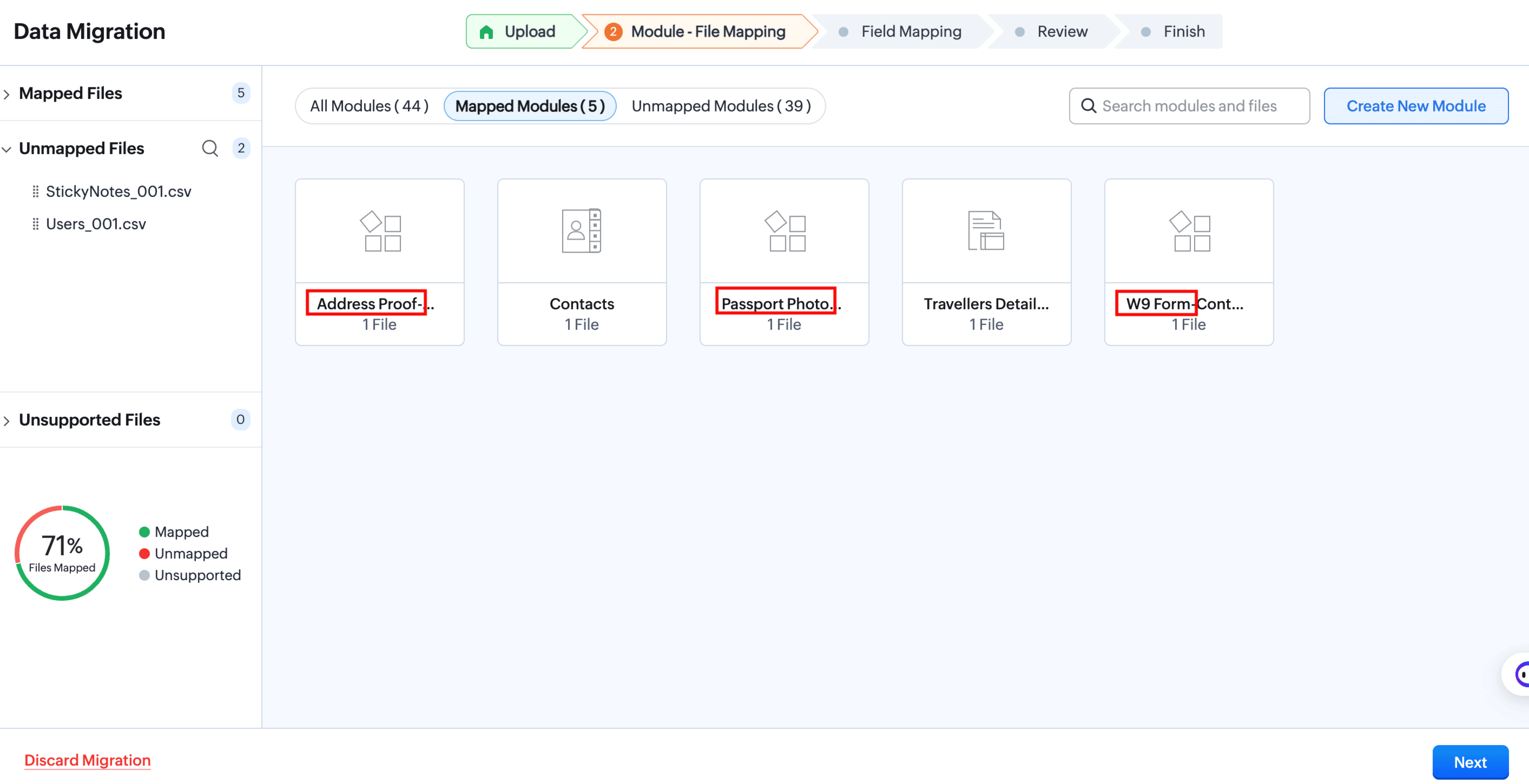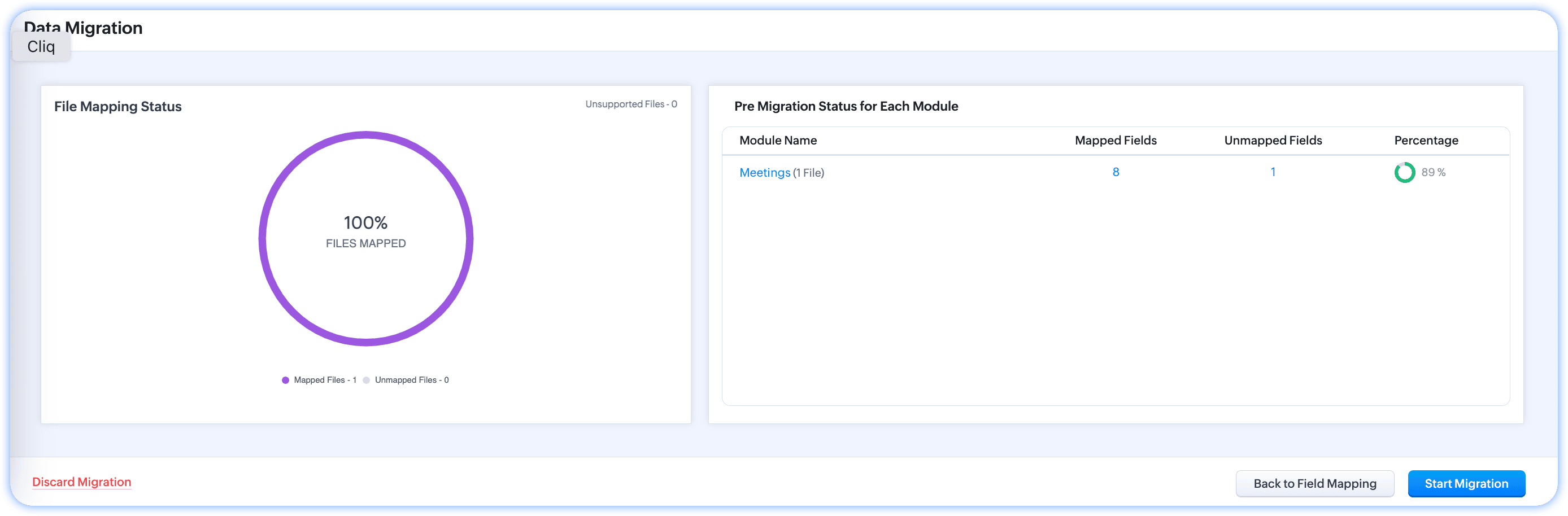 The Data Migration wizard in Zoho CRM ensures that your data is migrated accurately and helps you reduce much of the manual work. It automatically maps import files to CRM modules and import file columns to Zoho CRM fields. In the case of modules that are not already available, Zoho CRM creates them and maps the relevant files to them. It gives you a clear indication of the number files that are mapped, unmapped and any that are not supported.